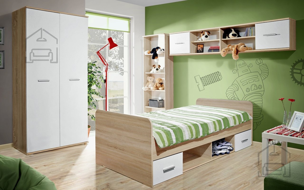 • 1x Bett mit Schubladen. Maße: 204x64x96 cm.