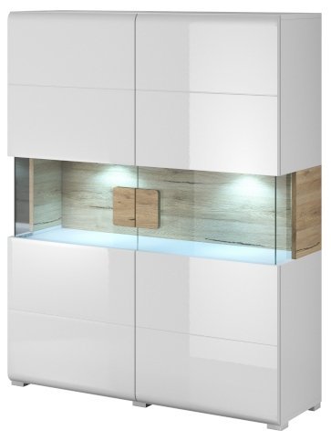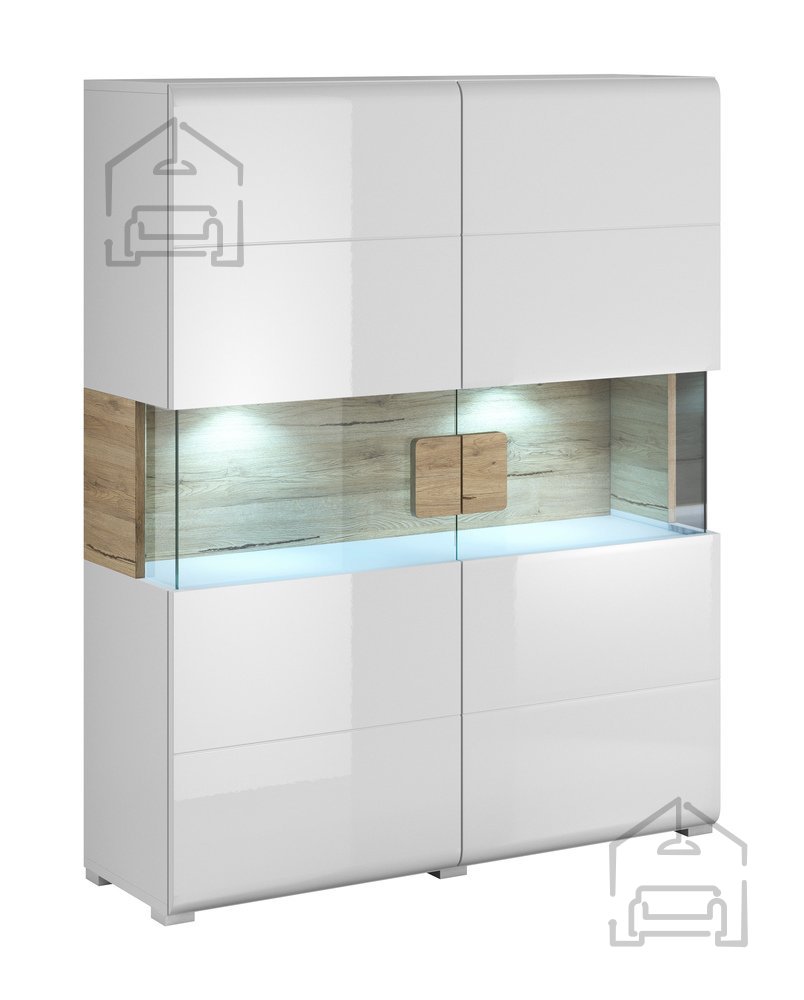 Die Vitrine Toledo mit den Maßen 122x39x152 cm, gefertigt aus MDF-Platten, ist äußerst durchdacht und modern gestaltet. Sie wird Ihr Wohnzimmer vollständig verändern und in Kombination mit den übrigen stilistisch passenden Möbelstücken (in unserem Onlineshop empfehlen wir die Serie Toledo) dafür sorgen, dass Ihr Wohnzimmer mit der Zeit und den modernen Trends Schritt hält. Die elegante weiße Hochglanzoberfläche in Kombination mit San-Remo-Eiche und einer optionalen LED-Beleuchtung schafft vor allem in den Abendstunden eine magische und angenehme Atmosphäre. Darüber hinaus überzeugt die Vitrine Toledo mit viel Stauraum und praktischen Aufbewahrungsmöglichkeiten. Wichtige Gegenstände, die Ihnen viel bedeuten, können Sie in der Glasvitrine besonders hervorheben.