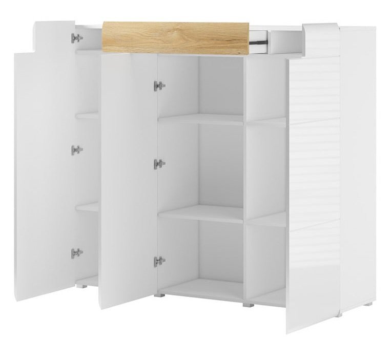 Wir präsentieren Ihnen die Kommode Toledo, die modernes Design und Praktikabilität vereint und somit die perfekte Wahl für jedes Zuhause ist. Mit ihrem eleganten Erscheinungsbild und hochwertigen Materialien wird dieses Möbelstück zum zentralen Element Ihres Wohnzimmers, Schlafzimmers oder Büros.