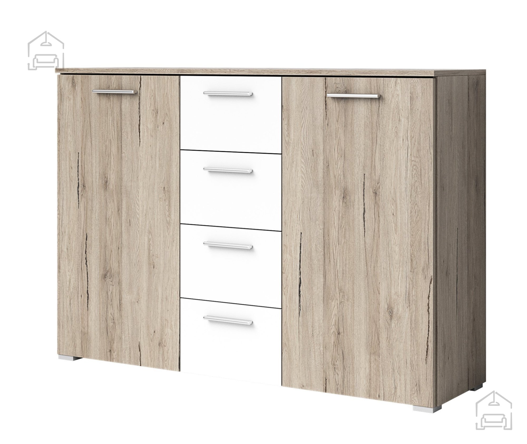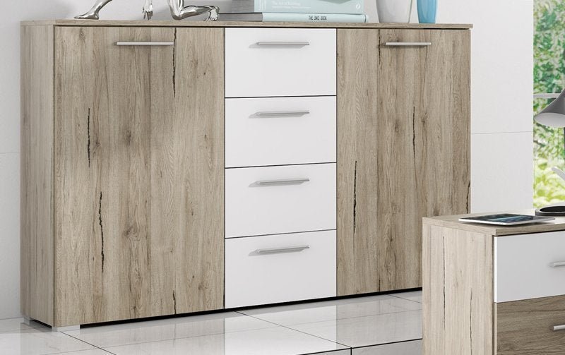 Die Kommode Beta ist mehr als nur ein Möbelstück; sie ist ein Kunstwerk, das Harmonie und Ordnung in Ihr Zuhause bringt. Mit ihrem durchdachten Design, das vier geräumige Schubladen in der Mitte und je einen Schrank auf beiden Seiten umfasst, bietet sie reichlich Stauraum für Ihre Lieblingsgegenstände, Kleidung oder andere Utensilien.