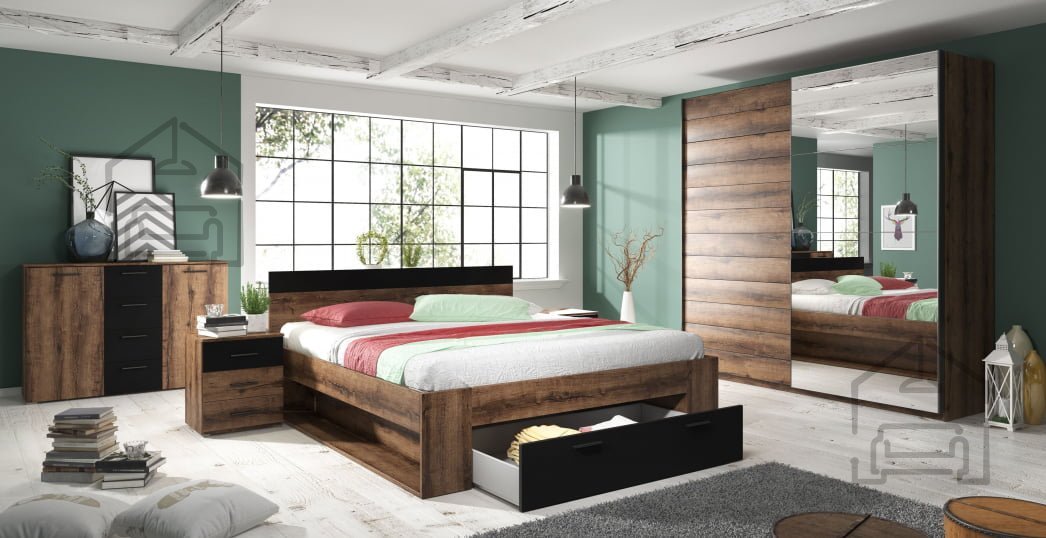 Willkommen in der Welt der Eleganz und Funktionalität mit dem Schlafzimmer Beta, das Ästhetik und Praktikabilität perfekt vereint. Dieses bezaubernde Möbelset in der Farbkombination aus dunkler Eiche und Schwarz ist so gestaltet, dass es die ideale Atmosphäre von Komfort und Modernität in Ihrem Schlafzimmer schafft.