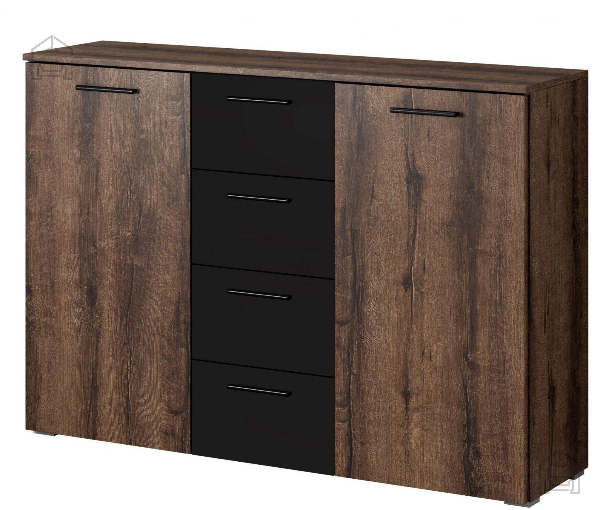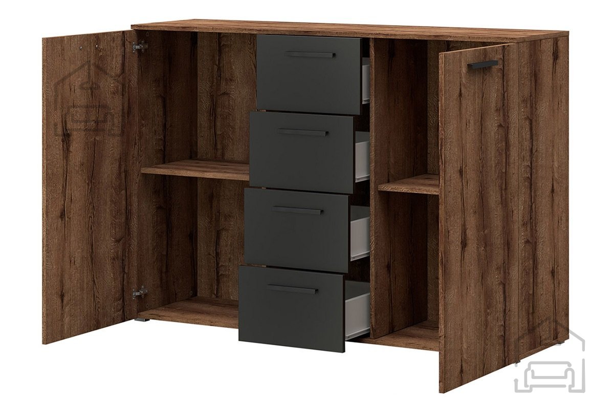 Die Kommode Beta mit den Maßen 132x38x93,3 cm ist so gestaltet, dass sie sich nahtlos in verschiedene Räume einfügt – vom Wohnzimmer bis zum Schlafzimmer. Hergestellt aus hochwertigem MDF-Material, garantiert sie Langlebigkeit und eine lange Lebensdauer, während sie gleichzeitig ein attraktives Erscheinungsbild bewahrt. Ihre Kombination aus dunkler Eiche und Schwarz verleiht ihr einen Hauch von Luxus und Raffinesse.