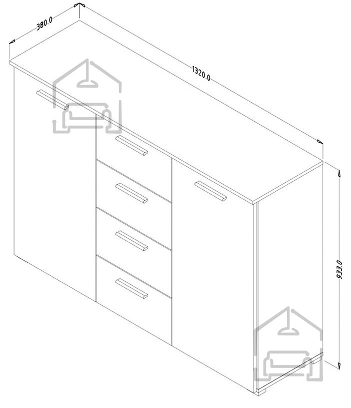 Mit 4 Schubladen in der Mitte und je einem Schrank auf beiden Seiten bietet die Kommode eine effiziente Aufbewahrung Ihrer Utensilien. Die Schubladen eignen sich ideal zur Organisation kleinerer Gegenstände, während die Schränke Platz für größere Dinge wie Bücher, Geschirr oder andere Haushaltsgegenstände bieten.