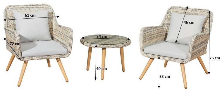 Die Maße sind so gewählt, dass sie ein angenehmes Sitzen ermöglichen, ohne zu viel Platz zu beanspruchen. Die leicht geneigte Rückenlehne unterstützt den Rücken und sorgt für eine entspannte Haltung, während der stabile Tisch mit seiner runden Platte genügend Platz für eine Tasse Kaffee, ein Glas Wein oder kleine Snacks bietet.