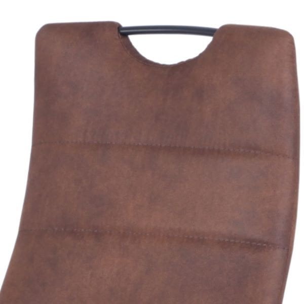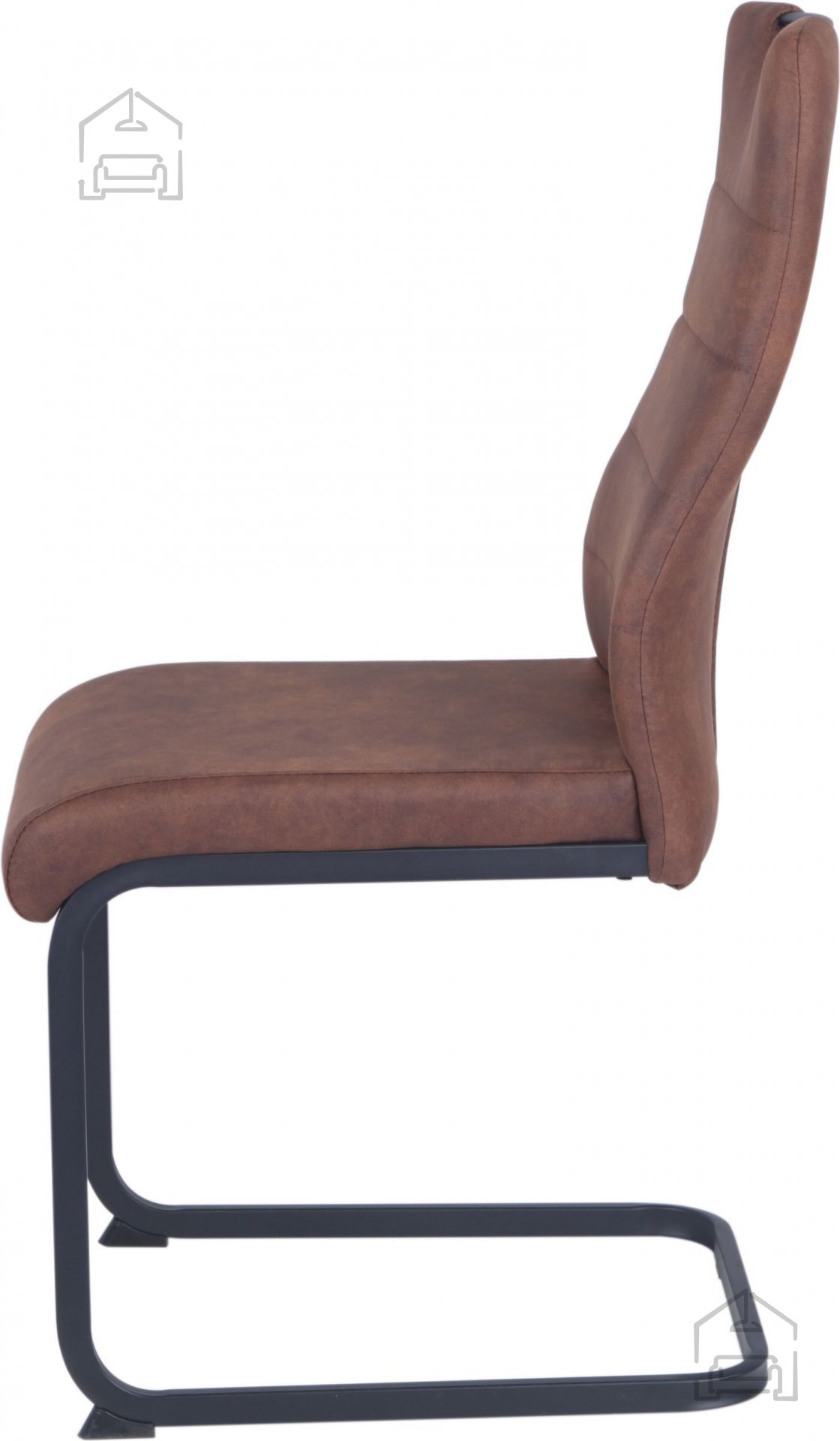 • Moderner Esszimmerstuhl, dessen Sitz- und Rückenfläche vollständig mit hochwertigem Stoff in brauner oder dunkelgrauer Farbe gepolstert ist.