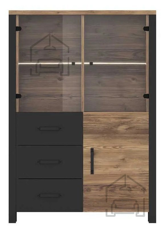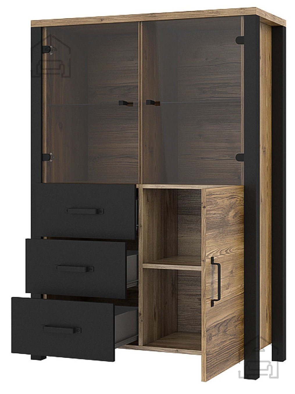 Die Vitrine Olin ist mehr als nur ein Möbelstück; sie ist ein Ausdruck Ihres Stils und Geschmacks. Hergestellt in der Fabrik Helvetia Meble in Polen, steht sie für erstklassiges europäisches Design und Fertigung. Ihre braune Farbe lässt sich mühelos mit verschiedenen Farbpaletten kombinieren und passt sich so ideal an Ihre bestehende Einrichtung an.