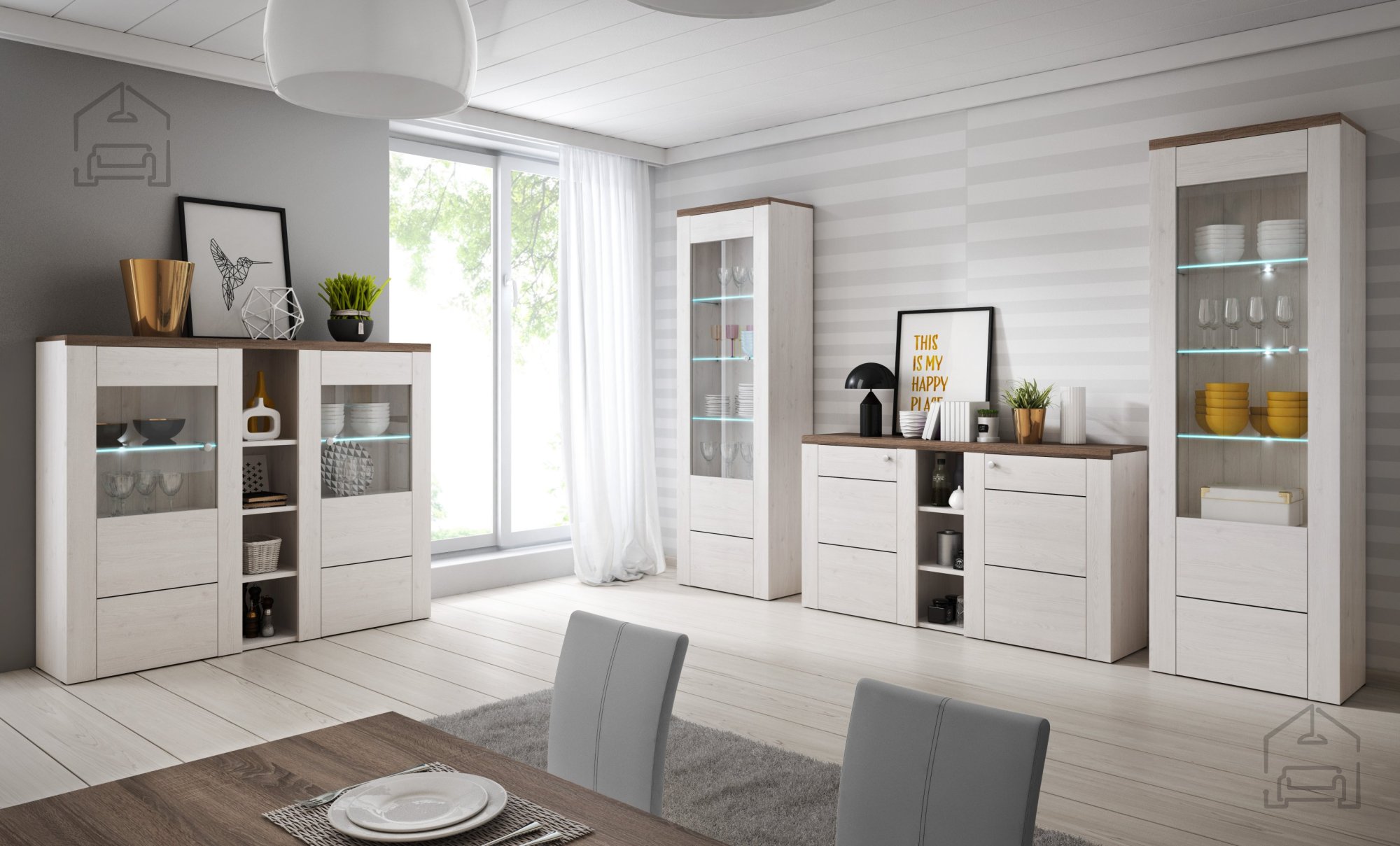 Verpassen Sie nicht die Gelegenheit, Ihr Zuhause mit dem Larona-Set zu bereichern. Seine Vielseitigkeit – von eleganten Vitrinen bis hin zu praktischen Kommoden – ermöglicht es, sich vollständig an Ihre Bedürfnisse anzupassen. Die optionale LED-Beleuchtung unterstreicht zusätzlich seine Einzigartigkeit und sorgt jederzeit für eine angenehme Atmosphäre.