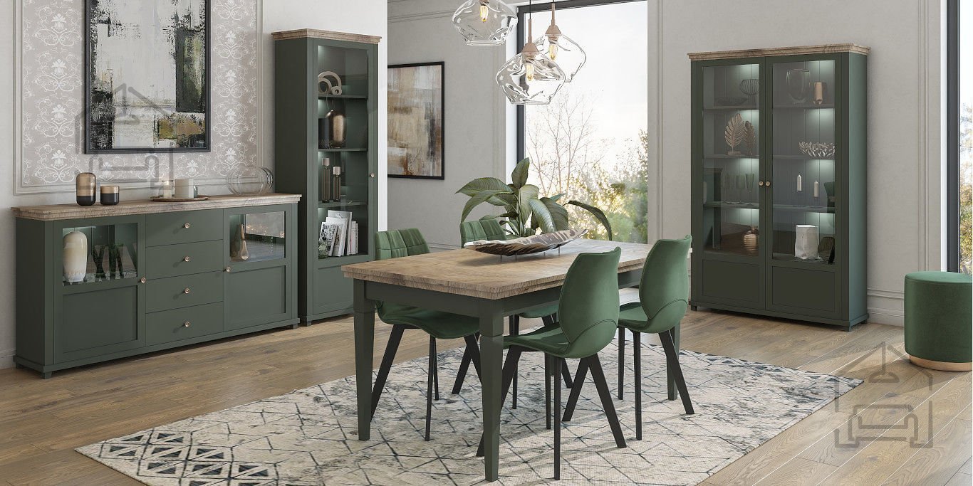 Die Vitrine Evora - grün - 24ZRJU05/06 ist nicht nur ein Möbelstück; sie ist ein Stil-Statement, das Ästhetik und Funktionalität vereint. Ob Sie Stauraum suchen oder Ihrem Wohnzimmer einen eleganten Akzent verleihen möchten – diese Vitrine ist die perfekte Wahl. Mit der Option einer LED-Beleuchtung und der Verwendung hochwertiger Materialien ist die Vitrine Evora eine ideale Investition für jedes Zuhause. Bringen Sie einen Hauch polnischer Tradition in Ihr Zuhause und genießen Sie das raffinierte Design, das Sie und Ihre Gäste begeistern wird.