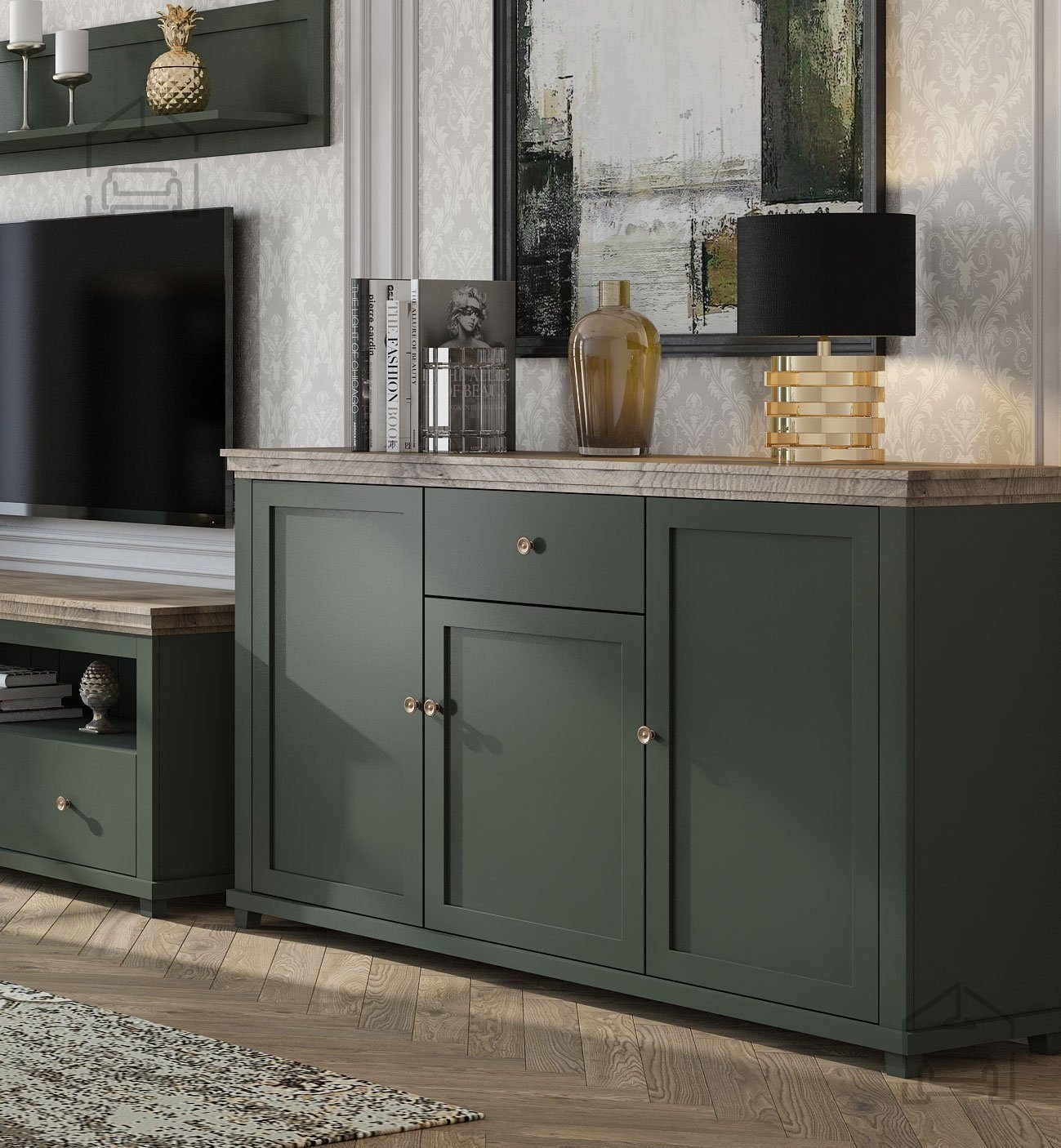Entdecken Sie die perfekte Balance zwischen Stil und Praktikabilität mit unserer Kommode 3 Evora - grün - 24ZRJU47. Diese außergewöhnliche Kommode, gefertigt aus hochwertigem MDF-Material, bringt einen Hauch raffinierter Eleganz und zeitloser Schönheit in Ihr Zuhause. Mit den Maßen 160x42x93,3 cm bietet sie ausreichend Stauraum und verbessert gleichzeitig mit ihrem ästhetischen Erscheinungsbild das gesamte Ambiente Ihres Wohnraums.