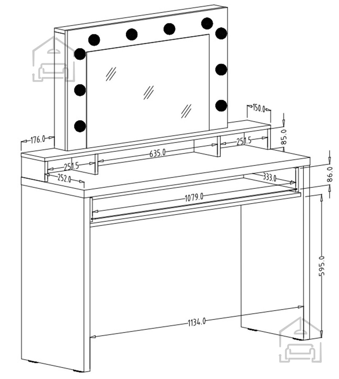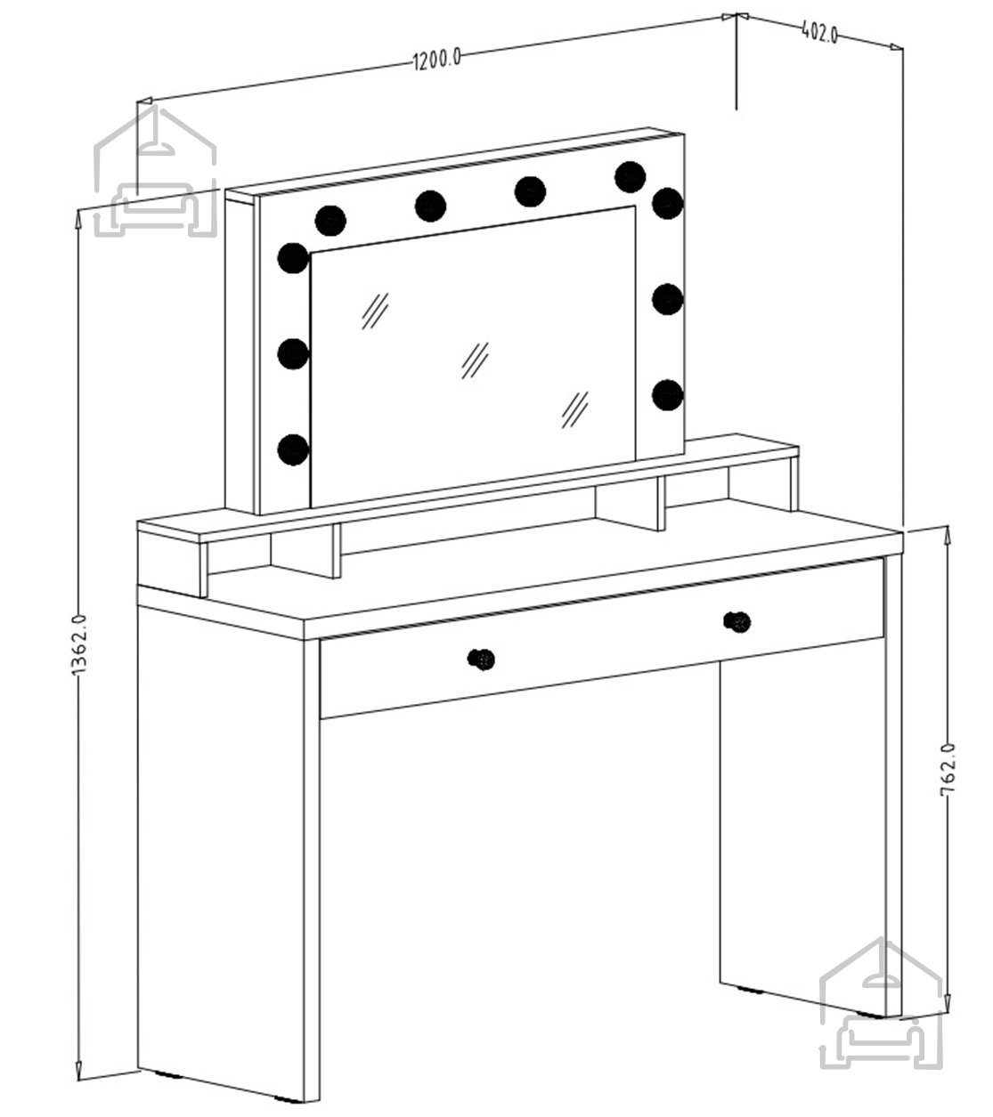 Der Schminktisch Aria misst 120x40,2x136,2 cm und bietet damit ausreichend Platz für all Ihre Schmink- und Schreibbedürfnisse. Er ist aus MDF-Material gefertigt, das Langlebigkeit und Stabilität garantiert. MDF ist bekannt für seine Feuchtigkeitsresistenz und lange Lebensdauer, was bedeutet, dass dieser Tisch Sie viele Jahre im Alltag begleiten wird.