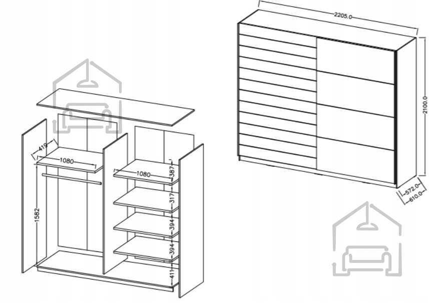 Einer der Hauptvorteile dieses Kleiderschranks ist seine Geräumigkeit. Mit einer Höhe von 210 cm und einer Breite von 220,5 cm bietet er ausreichend Platz für die Organisation Ihrer Kleidung, Schuhe und anderer persönlicher Gegenstände. Das durchdachte Innenleben umfasst mehrere Regale und einen Bereich zum Aufhängen, was eine flexible Aufbewahrung je nach Bedarf ermöglicht.