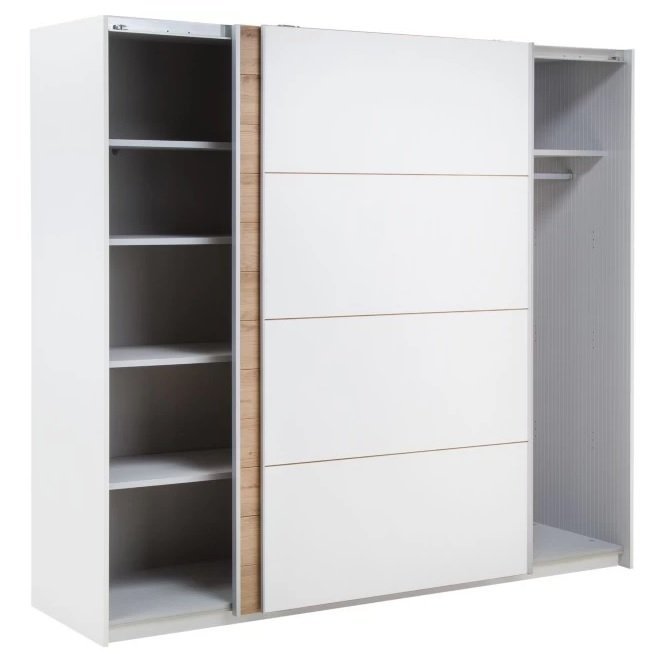 Mit dem Galaxy Schrank bringen Sie einen Hauch von Eleganz und Modernität in Ihr Zuhause. Der helle Eichenkorpus und die weiße Front schaffen eine raffinierte Farbharmonie, die sich leicht in verschiedene Einrichtungsstile einfügt. Klare Linien und glatte Oberflächen der Schiebetüren ermöglichen eine einfache Integration in jedes Schlafzimmer, jeden Flur oder jede Garderobe.