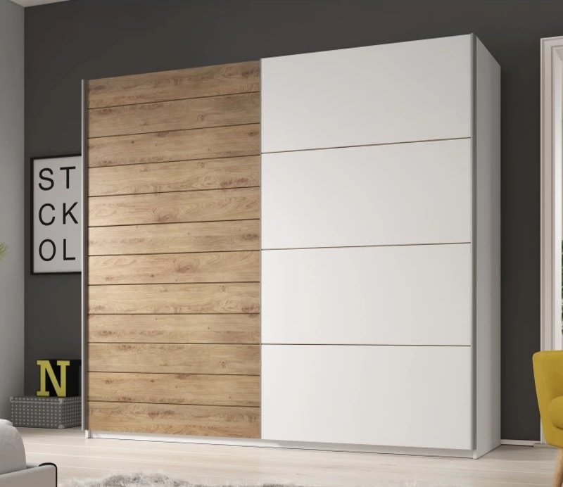 1. Kombination aus Eleganz und Funktionalität: Perfekt für jedes moderne Zuhause mit elegantem Design und praktischer Innenaufteilung. 2. Hochwertige Materialien: MDF und Oberflächen sorgen für eine lange Lebensdauer und Widerstandsfähigkeit gegen tägliche Abnutzung. 3. Geräumigkeit: Bietet Platz für eine große Menge an Kleidung und Accessoires und hilft so, Ihr Zuhause ordentlich zu halten. 4. Einfache Montage: Schneller Aufbau und mühelose Pflege. Ob Sie nun Ihr Schlafzimmer modernisieren oder zusätzlichen Stauraum im Flur benötigen – der Galaxy Kleiderschrank mit Schiebetüren ist eine ausgezeichnete Wahl. Die elegante Kombination aus heller Eiche und Weiß verleiht jedem Raum Frische und sorgt gleichzeitig für die Funktionalität, die Sie für ein organisiertes Leben brauchen.
