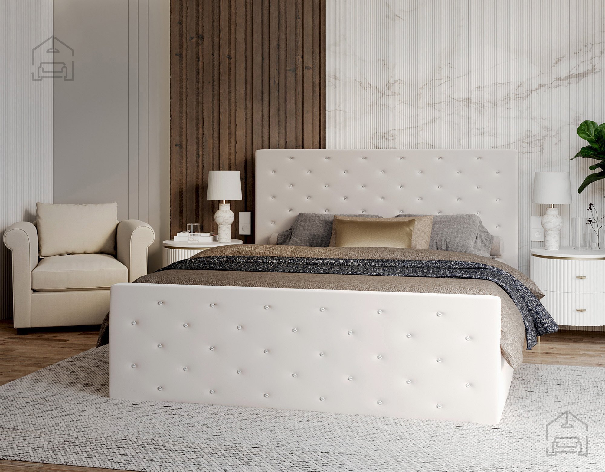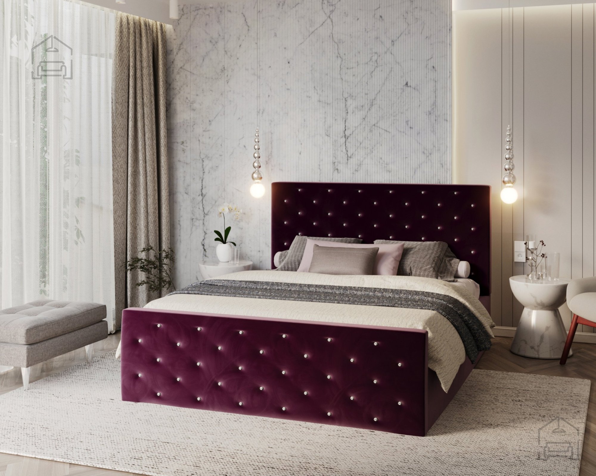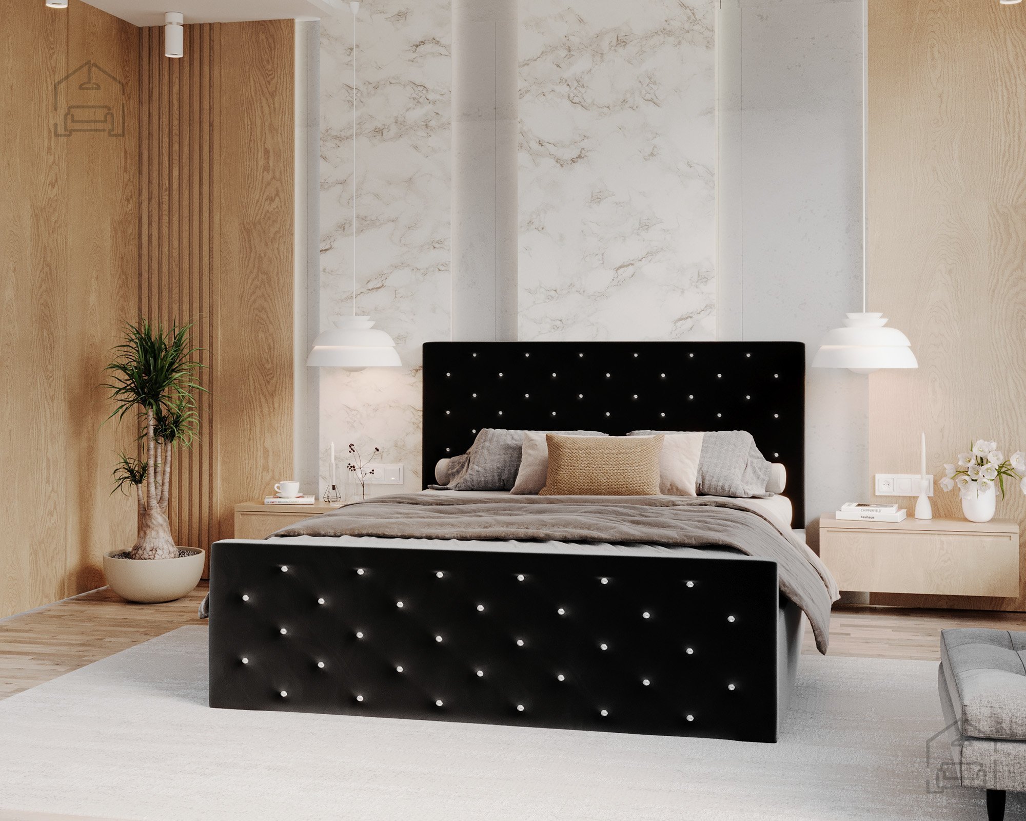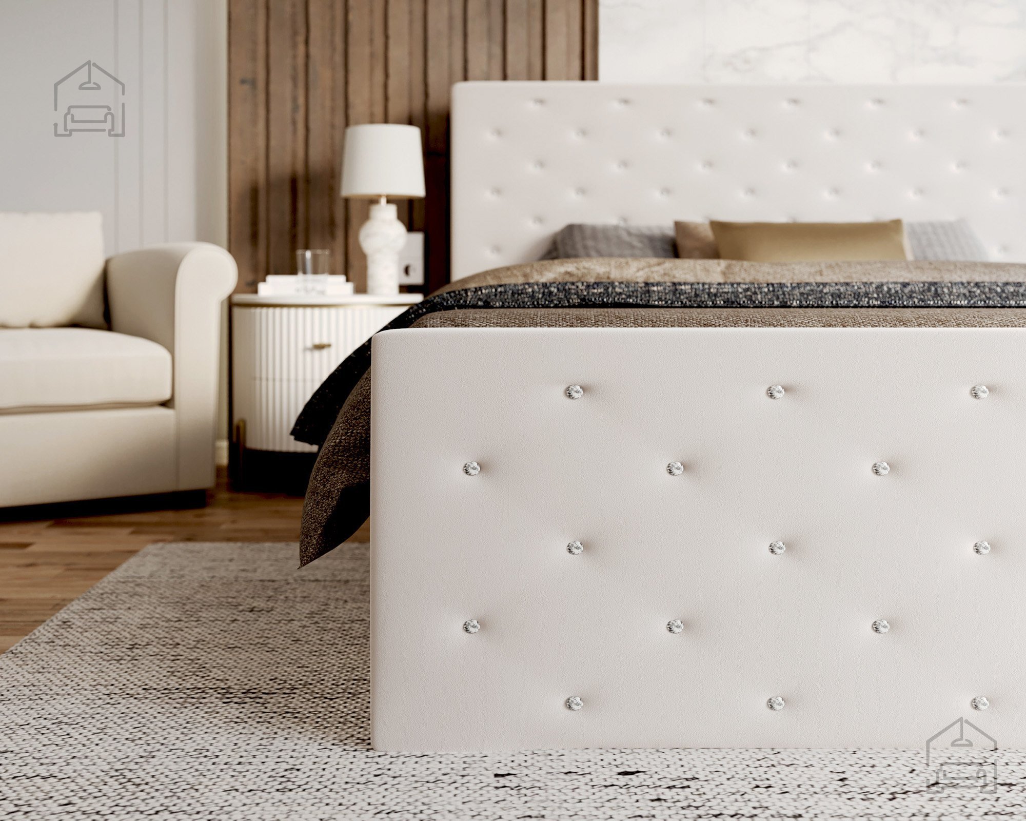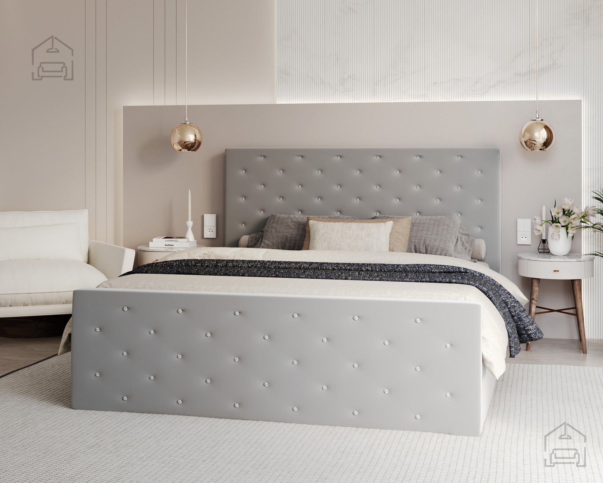 Der Bettrahmen ist gepolstert und aus strapazierfähigem Holz und Spanplatte gefertigt, was Stabilität ohne Quietschen gewährleistet. Das Kopfteil und der vordere Teil sind horizontal gesteppt, was einen eleganten visuellen Effekt erzeugt und gleichzeitig den Komfort beim Sitzen oder Lesen im Bett erhöht. Die gesteppten Linien verleihen dem Bett Charakter, unabhängig von der gewählten Stofffarbe, sodass das Modell Passion gut zu verschiedenen Einrichtungsstilen passt – von minimalistisch bis romantisch.