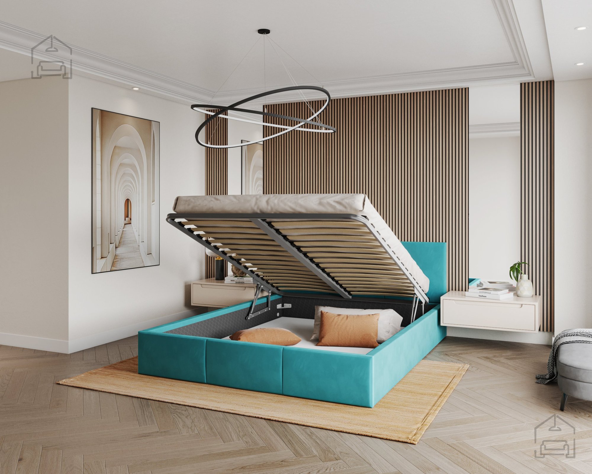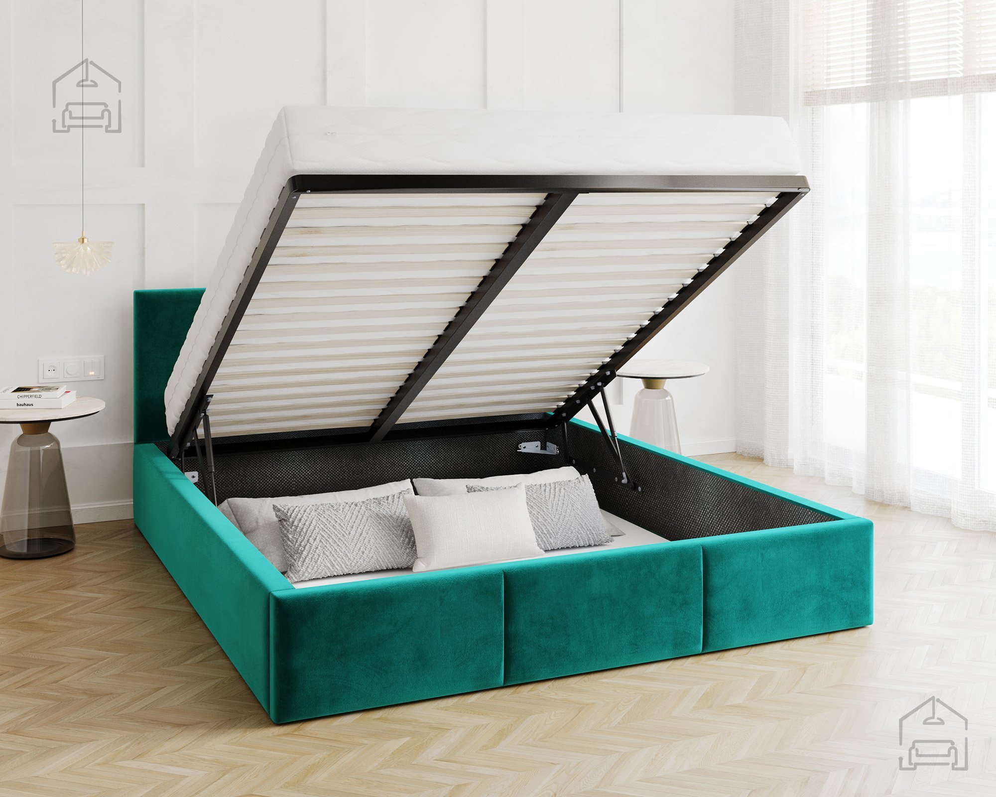 Einer der größten Vorteile des Modells Fresia ist der Hebemechanismus, der einen einfachen Zugang zur geräumigen Schublade unter der Liegefläche ermöglicht. Der Mechanismus basiert auf zwei Stahl-Gasfedern, die ein sanftes und sicheres Anheben ohne Anstrengung gewährleisten. Diese Lösung ist besonders nützlich in kleineren Räumen, in denen kein Platz für zusätzliche Schränke oder Kommoden ist. Die Schublade ist ideal zur Aufbewahrung von Bettwäsche, saisonaler Kleidung oder zusätzlichen Decken und hilft, das Schlafzimmer ordentlich und luftig zu halten.
