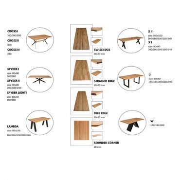 Platte mit geradem Rand (Stärke 40 mm), mit natürlichem Rand (Stärke 40 mm), Schweizer Kante (Stärke 40 mm), mit natürlicher Multi-Kante (Stärke 40 mm) sowie Mischkante (Stärke 20 + 20 mm).