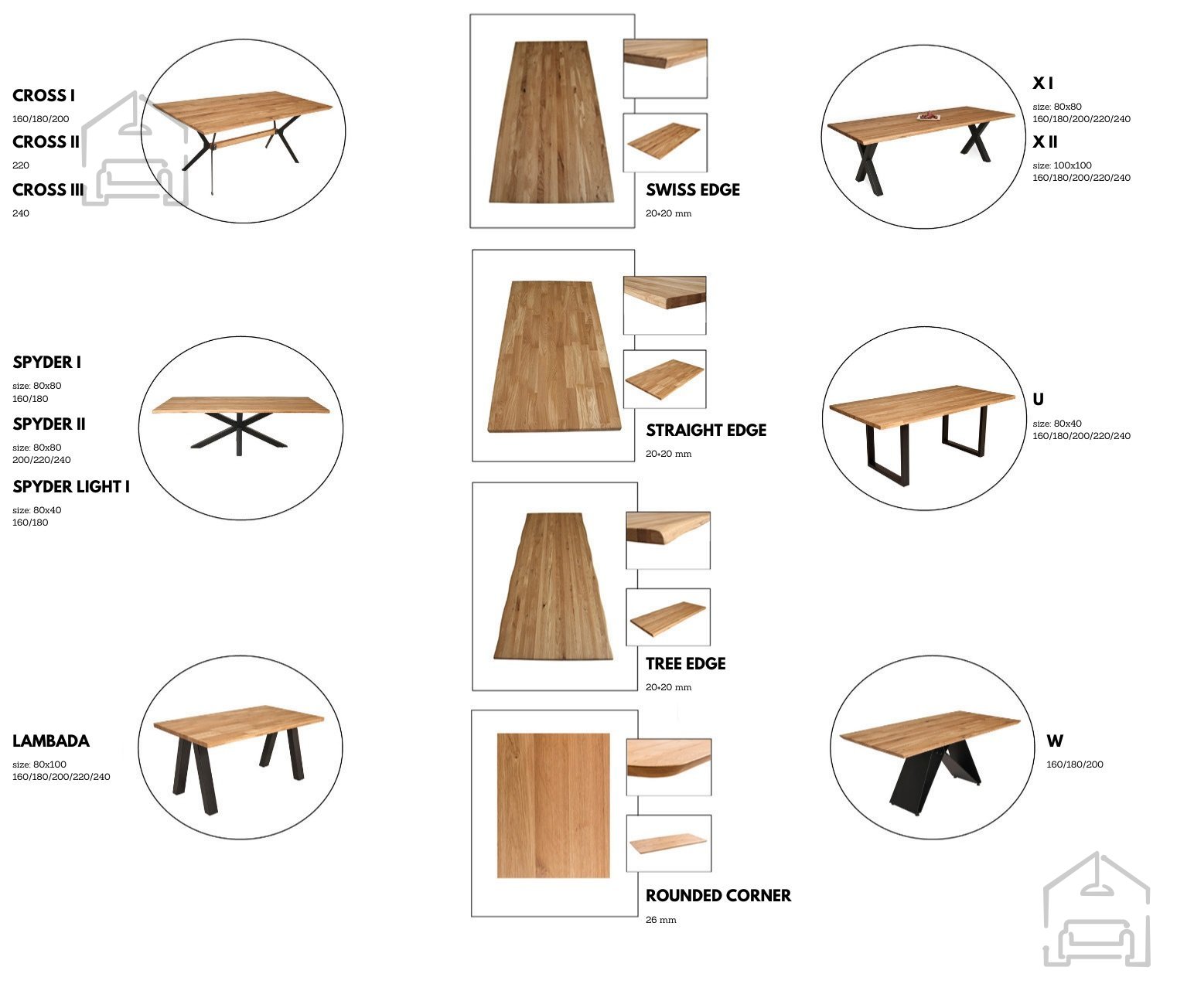 Es sind auch verschiedene Formen von Tischbeinen erhältlich (Lambada, U, X, W, A Spyder und Cross).
