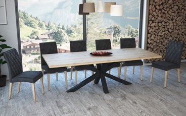 Die Tischplatten bestehen aus massivem, geöltem Eichenholz in rustikaler Ausführung.