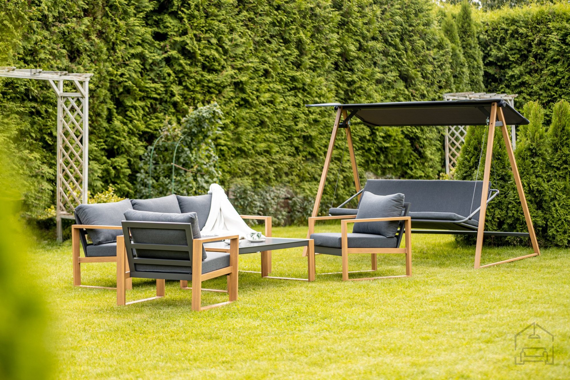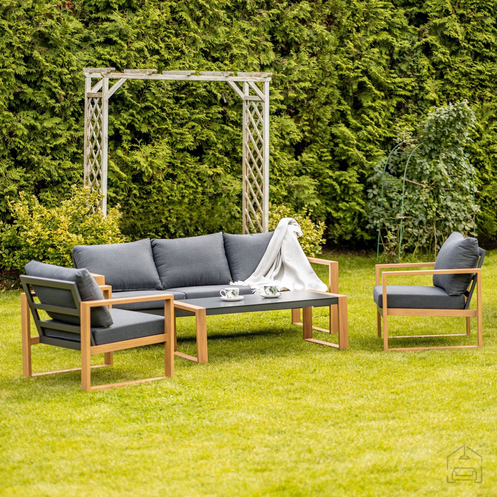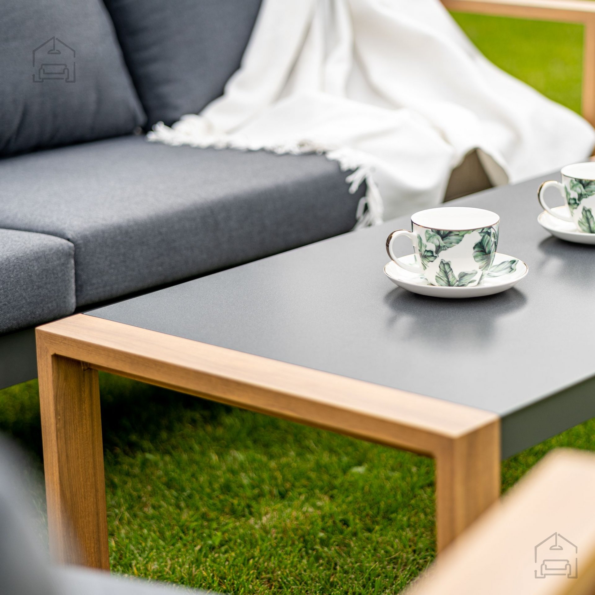 Die Kombination aus Aluminiumrahmen mit Elementen, die Holz imitieren, ergibt eine modische und minimalistische Struktur, die sich hervorragend für moderne Gestaltungen von Außenbereichen zur Entspannung eignet. Die Möglichkeit, die Position der einzelnen Elemente des Sets beliebig zu konfigurieren, ermöglicht die Gestaltung nahezu jedes Außenbereichs.