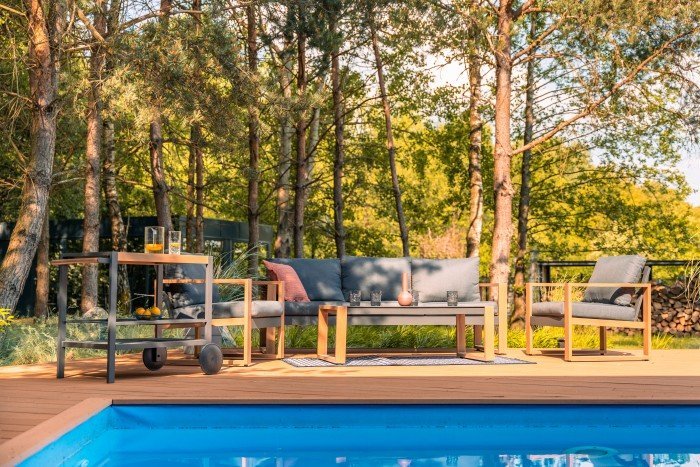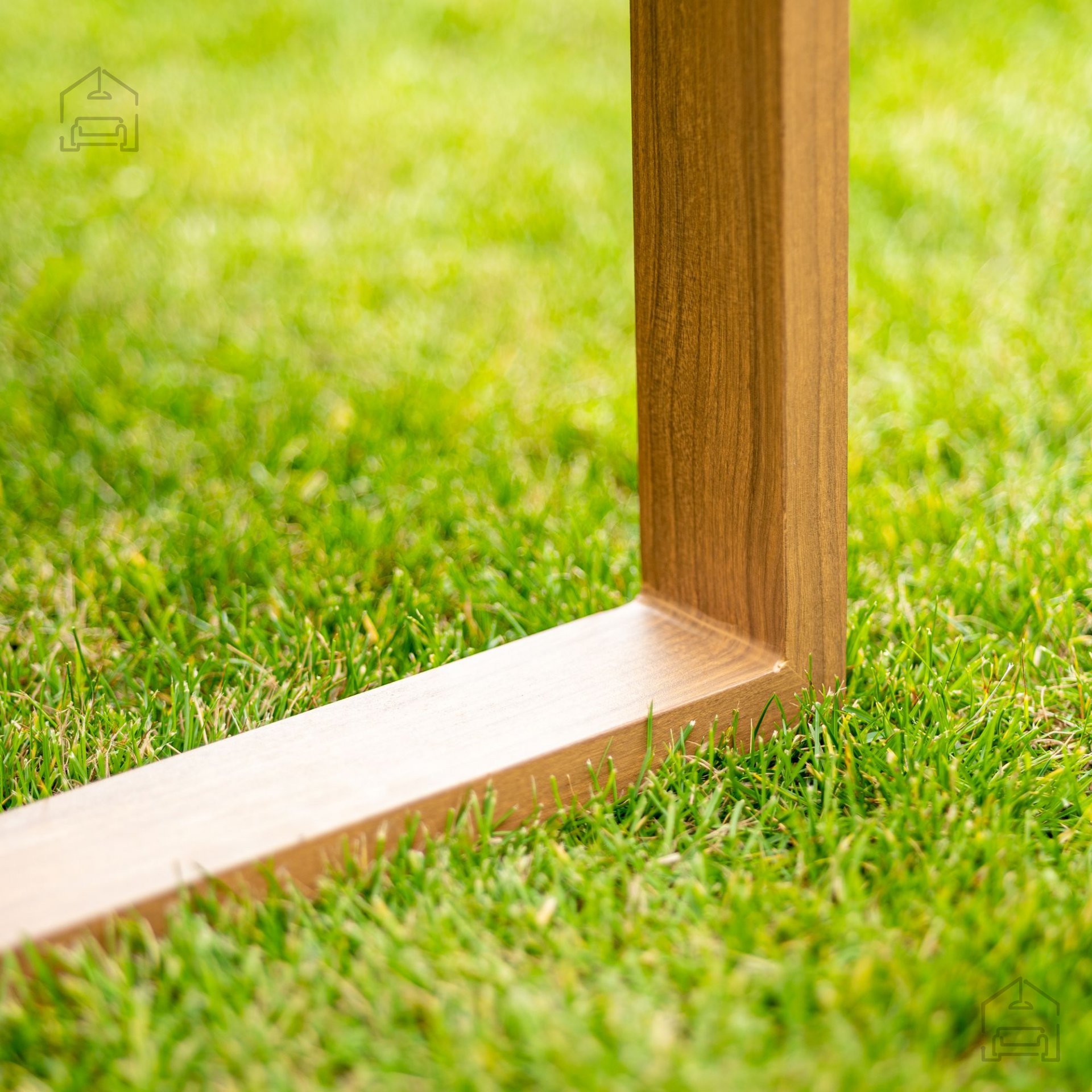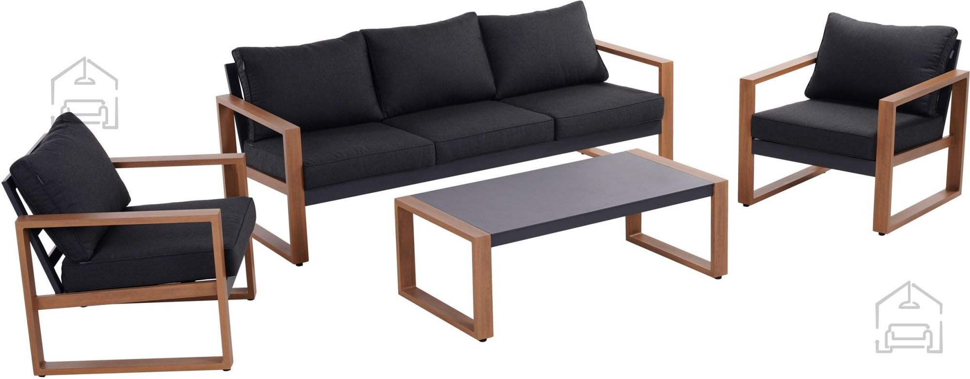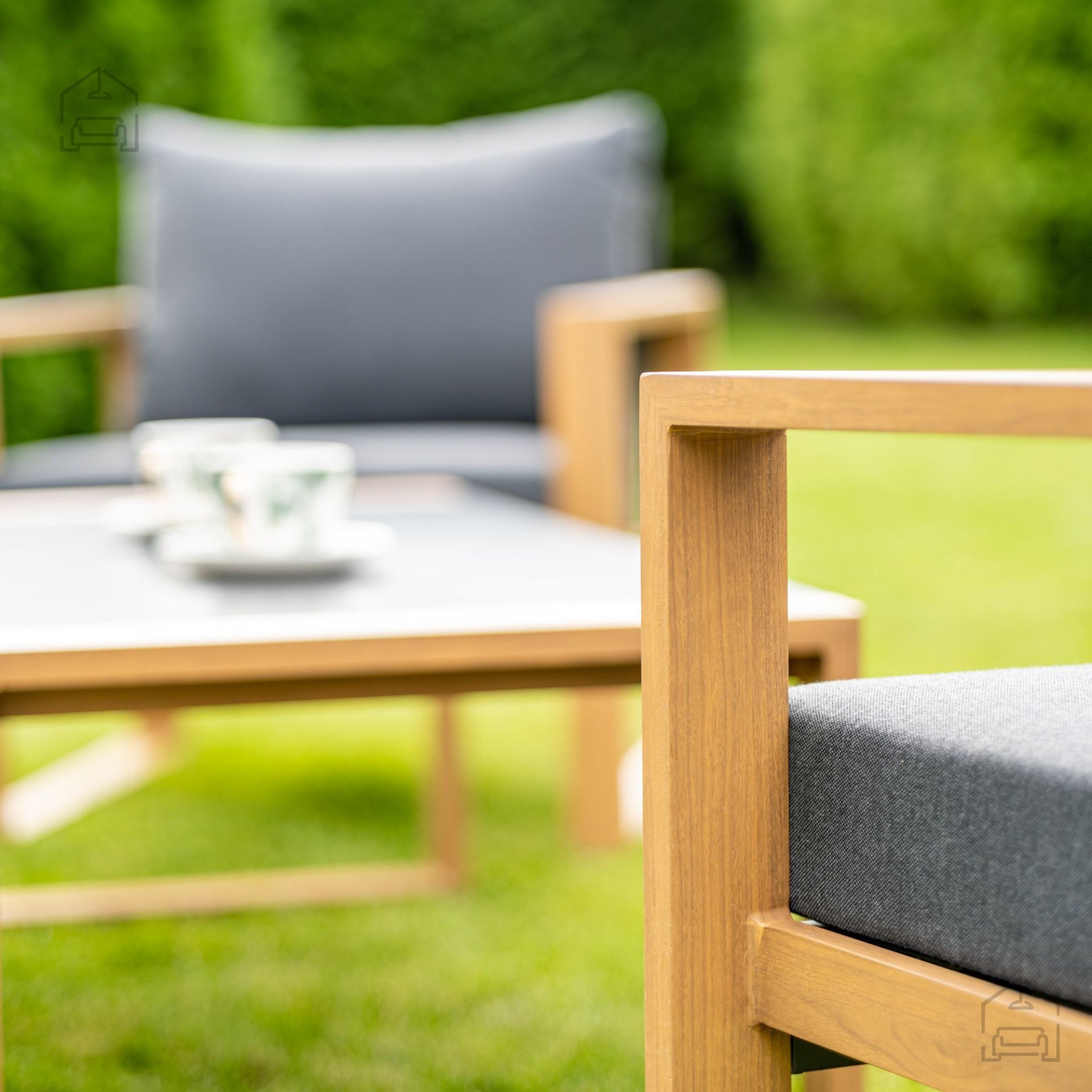 Die Kombination aus Aluminiumrahmen mit Elementen, die Holz imitieren, ergibt eine modische und minimalistische Struktur, die sich hervorragend für moderne Gestaltungen von Außenbereichen zur Entspannung eignet. Die Möglichkeit, die Position der einzelnen Elemente des Sets beliebig zu konfigurieren, ermöglicht die Gestaltung nahezu jedes Außenbereichs.