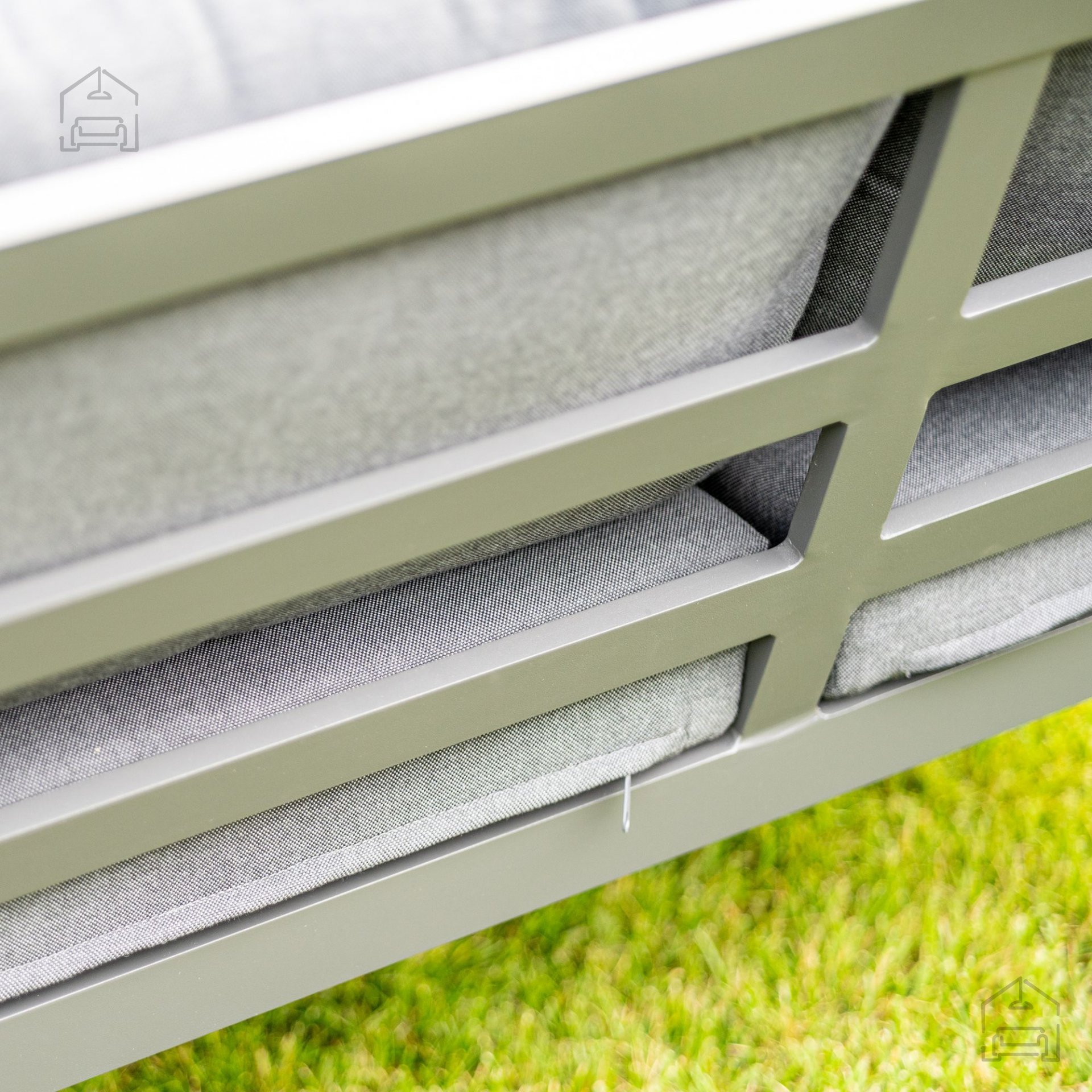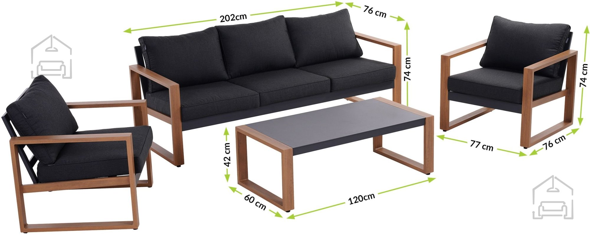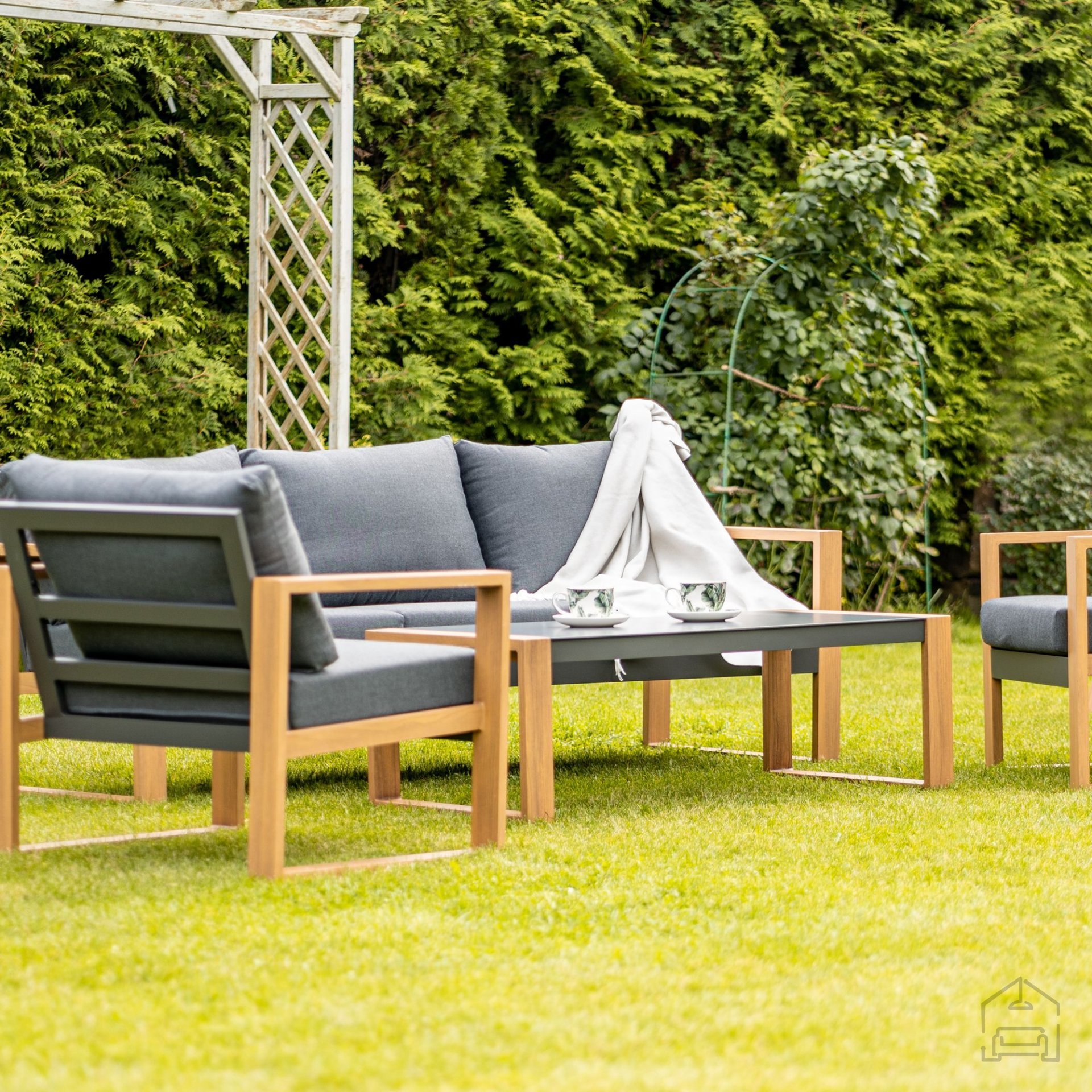 Modernes Gartenset für 5 Personen für Garten und Terrasse. Das Set besteht aus 4 Elementen: einem 3-Sitzer, 2 Sesseln und einem Tisch. Die Aluminiumkonstruktion zeichnet sich durch erhöhte Beständigkeit gegen Korrosion und mögliche Beschädigungen aus. Auf den Sitzen und der Rückenlehne befinden sich weiche Kissen mit Polyesterbezug, die leicht zu reinigen sind – ausgestattet mit einem Reißverschluss. Dank der verwendeten Materialien wird die Möbelgarnitur lange halten. Praktische Armlehnen in Kombination mit richtig geformten Sitzen und Kopfstützen sorgen für komfortable Erholung.