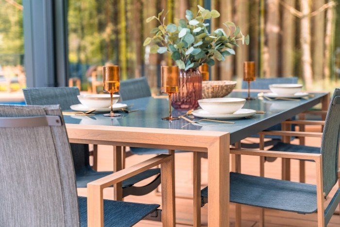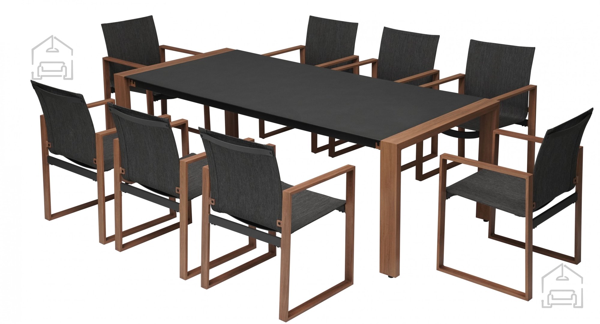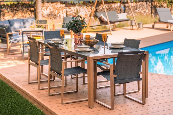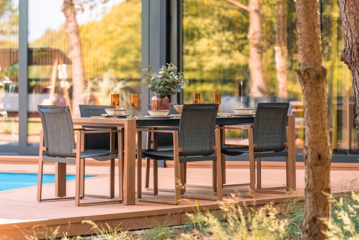 Das Set zeichnet sich durch ein minimalistisches Design aus. Die Kombination aus graphitfarbenen Sitzen und einer Tischplatte mit einem Rahmen in Holzfarbe wirkt elegant und passt zu den aktuellen Einrichtungstrends. Das große Set kann mit einer Pergola kombiniert werden, die beim Entspannen wirksam vor der Sonne schützt. Daneben kann man einen Grill aufstellen und so einen Bereich für Liebhaber des Kochens im Freien schaffen.