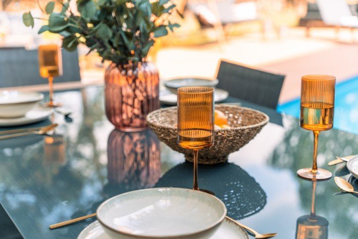 Ein großes Essmöbel-Set mit 8 Stühlen und einem massiven Tisch ist ein Vorschlag für Liebhaber des Essens im Freien. Das Set für 8 Personen eignet sich hervorragend für Familienabende und Treffen mit Freunden. Der Aluminiumrahmen sorgt für Stabilität und ist korrosionsbeständig, was eine längere Haltbarkeit der Möbel bedeutet. Ein unbestreitbarer Vorteil des Sets ist der große Tisch mit einer praktischen Platte aus gehärtetem Glas, die sehr kratzfest ist. Die Stühle sind so gestaltet, dass sie einen bequemen Sitzkomfort bieten. Bequeme Armlehnen entlasten Ihre Arme. Dank der verwendeten Materialien werden die Möbel mehrere Saisons überdauern.