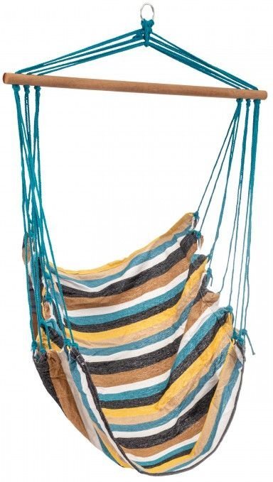 Ein Hängesessel im brasilianischen Stil, der gemütliches Schaukeln und entspanntes Ausruhen ermöglicht. Gefertigt aus angenehm weicher Baumwolle. Aufgehängt an stabilen Seilen, die zusätzlich mit einem Holzstab verstärkt sind. Dank der hochwertigen Materialien bleibt dieser farbenfrohe Sessel lange schön und haltbar.