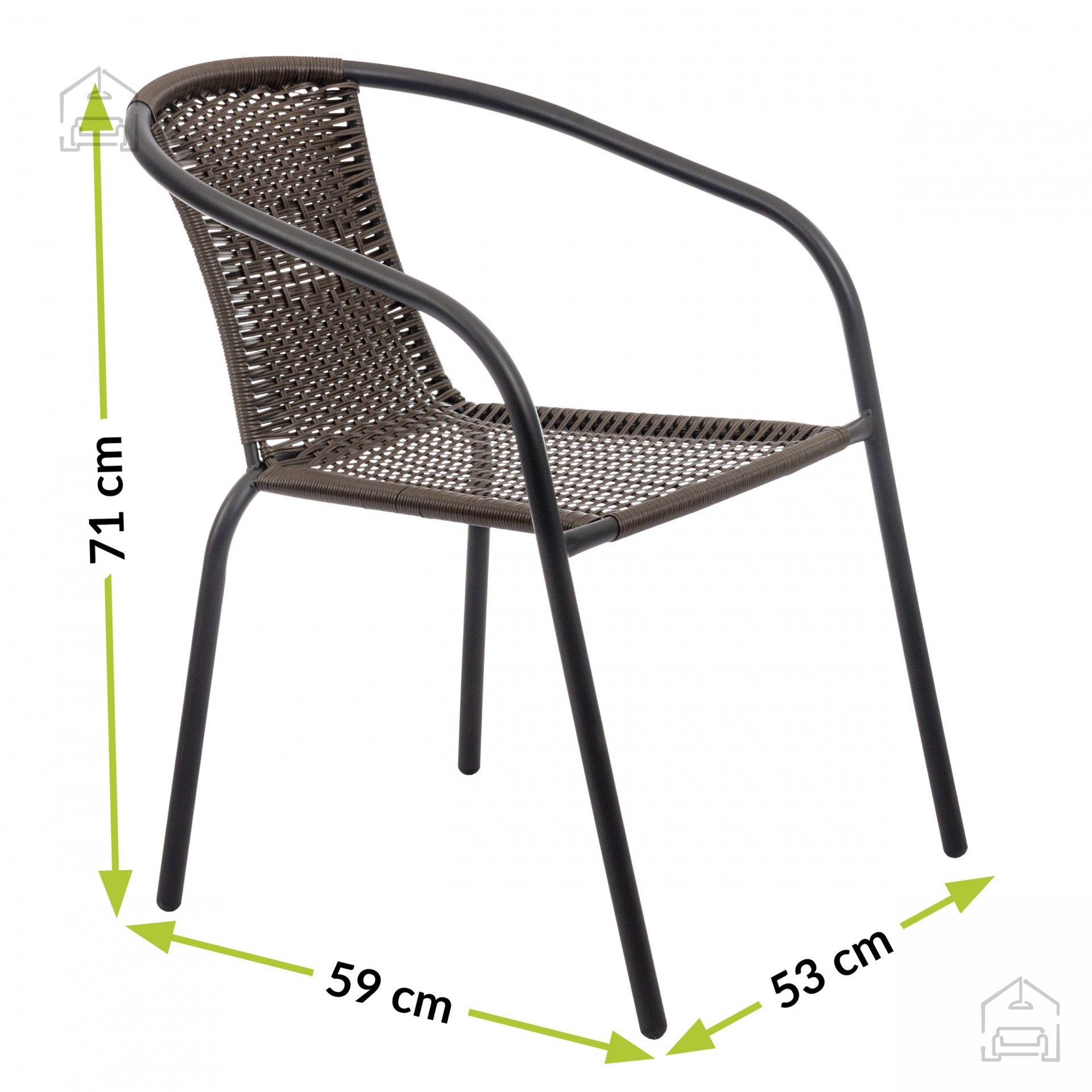 Ergonomischer Gartenstuhl aus Polyrattan. Dieses Material zeichnet sich durch seine hohe Witterungsbeständigkeit aus und eignet sich daher ideal für den Einsatz im Freien. Der Stahlrahmen sorgt für eine stabile Konstruktion. Die Sitzfläche ist optimal geformt und bietet in Kombination mit den Armlehnen angenehmen Komfort für die tägliche Entspannung. Die luftdurchlässige Sitzfläche ist besonders an heißen Tagen angenehm, da sie eine gute Luftzirkulation ermöglicht. Dieser stilvolle Stuhl ist überall dort praktisch, wo Sie eine bequeme Sitzgelegenheit brauchen – auf der Terrasse, dem Balkon oder im Garten.