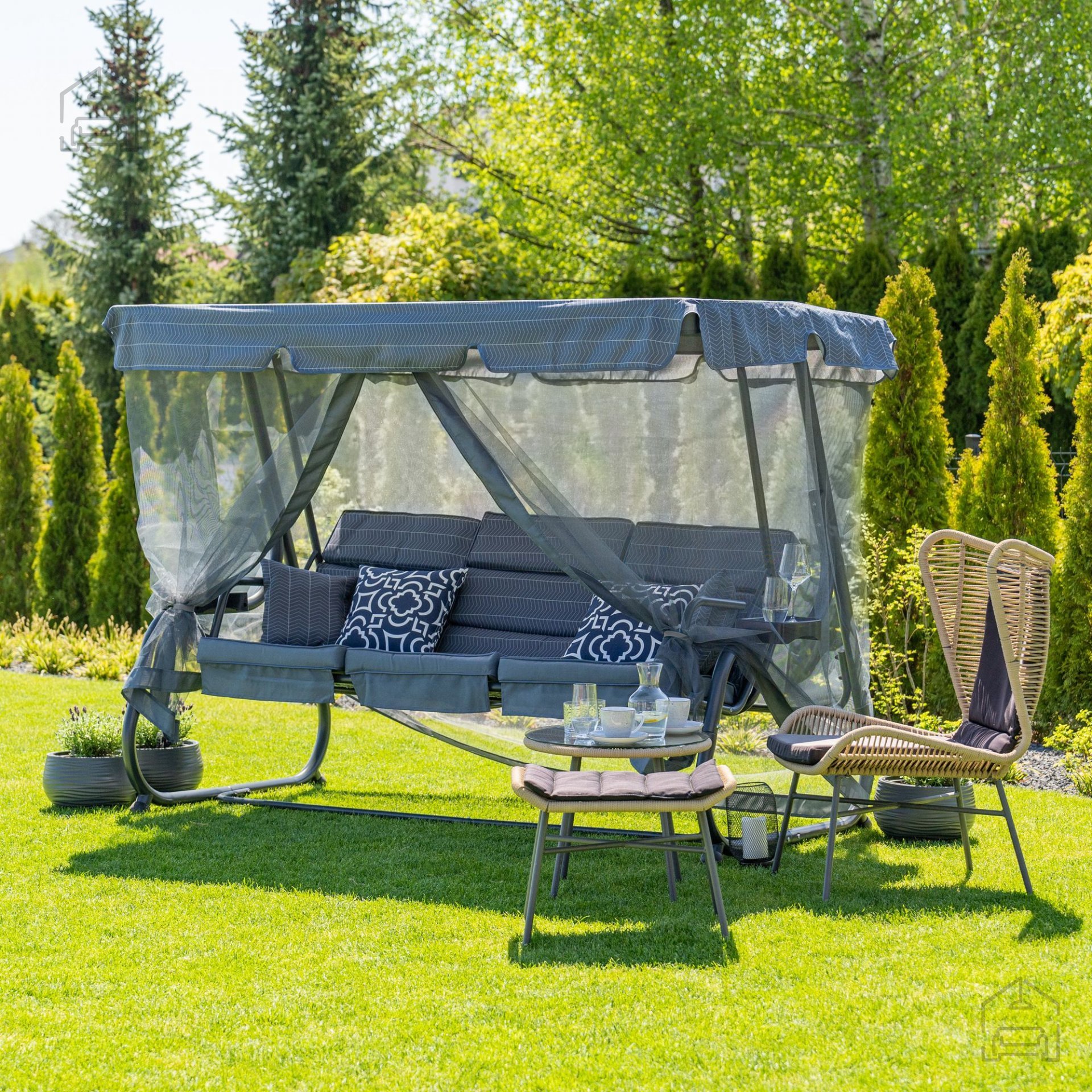 Die Schaukel eignet sich ideal für den Einsatz im Garten oder auf der Terrasse und sorgt in jeder Position für entspannte Momente. Das Dach und das Moskitonetz bieten Schutz vor Sonne, leichtem Regen und Insekten. Eine perfekte Wahl für alle, die stilvolles und funktionales Gartenmöbel schätzen.