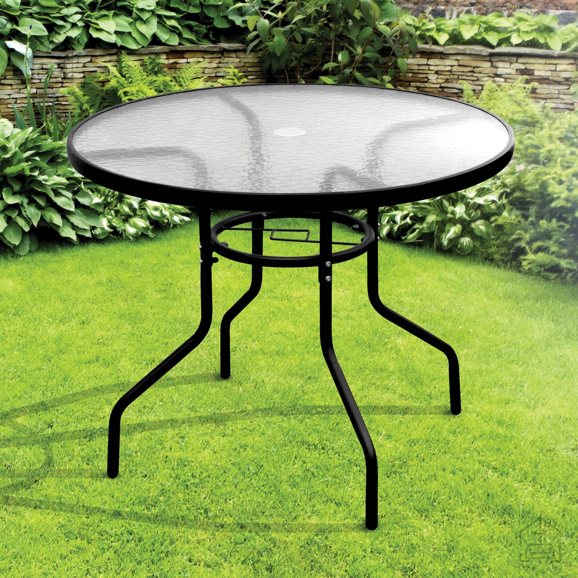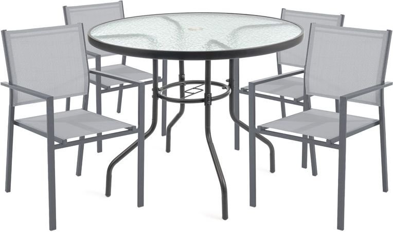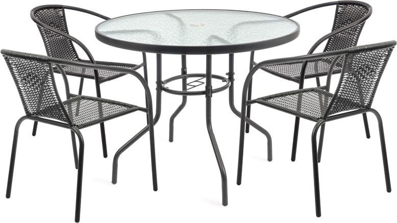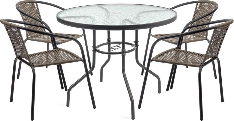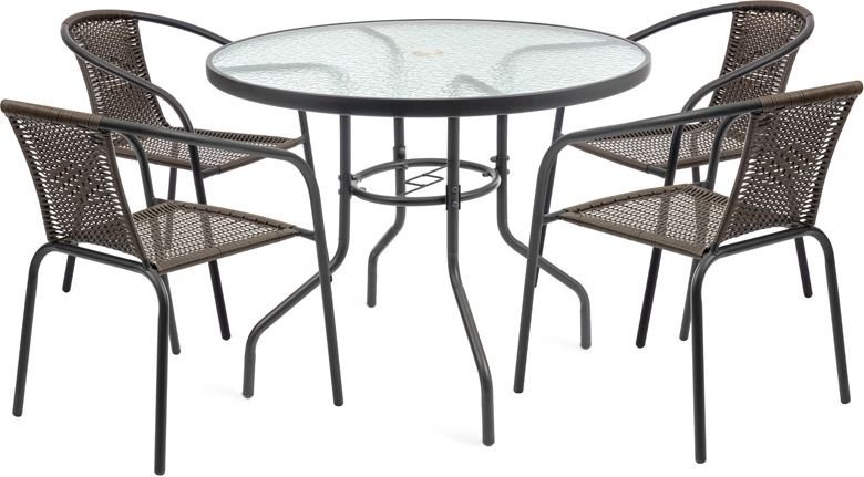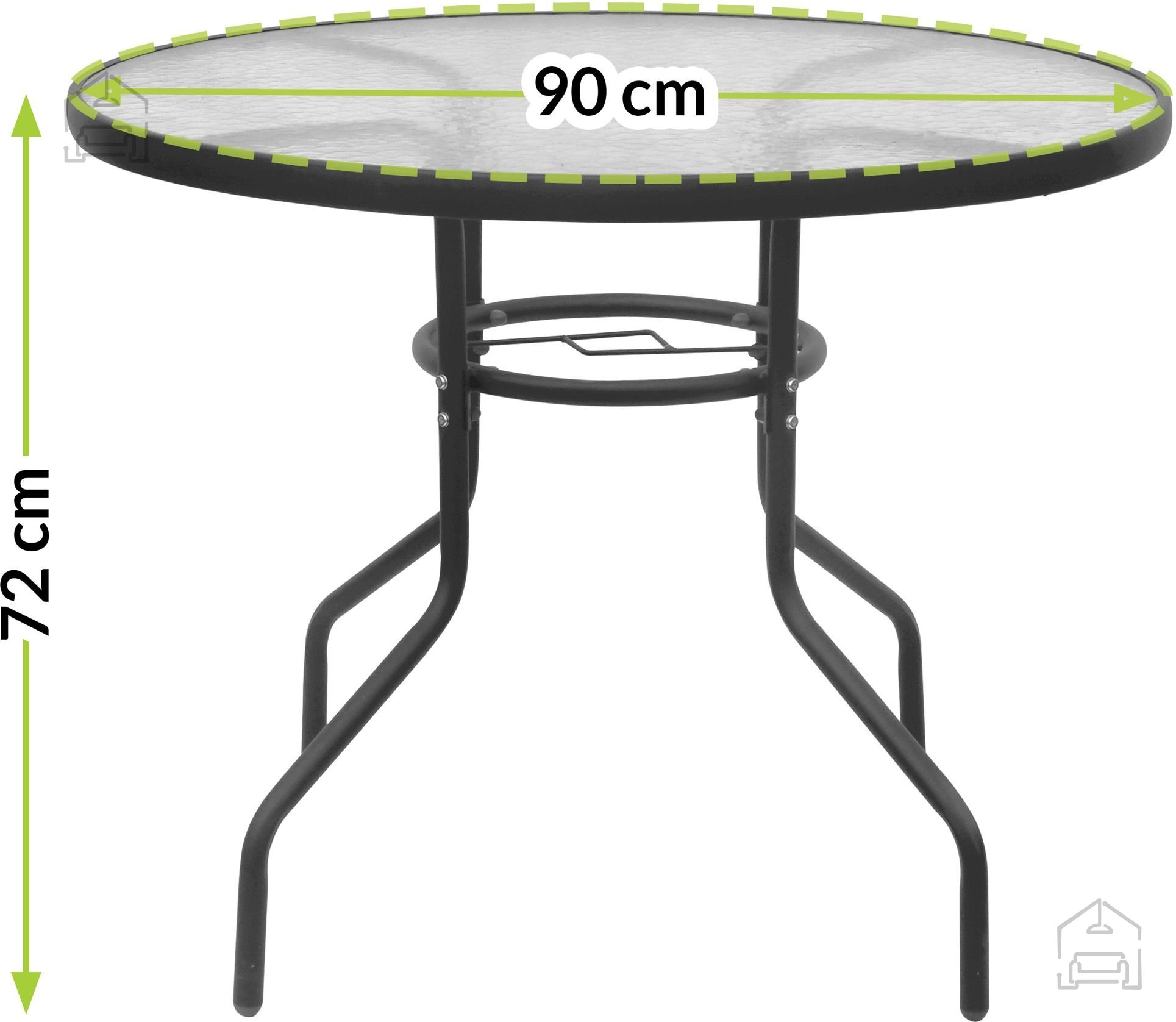 Der Rahmen und die Beine des Tisches bestehen aus hochwertigem Stahl, der Stabilität und eine lange Lebensdauer gewährleistet. Die Oberfläche ist so behandelt, dass sie korrosionsbeständig und für den Außenbereich geeignet ist. Die Tischplatte besteht aus 5 mm starkem gehärtetem Glas, was bedeutet, dass sie kratz- und stoßfest ist. Das Glas ist leicht zu reinigen – ein weiches Tuch und ein mildes Reinigungsmittel genügen, ohne aggressive Chemikalien, die die Oberfläche beschädigen könnten.