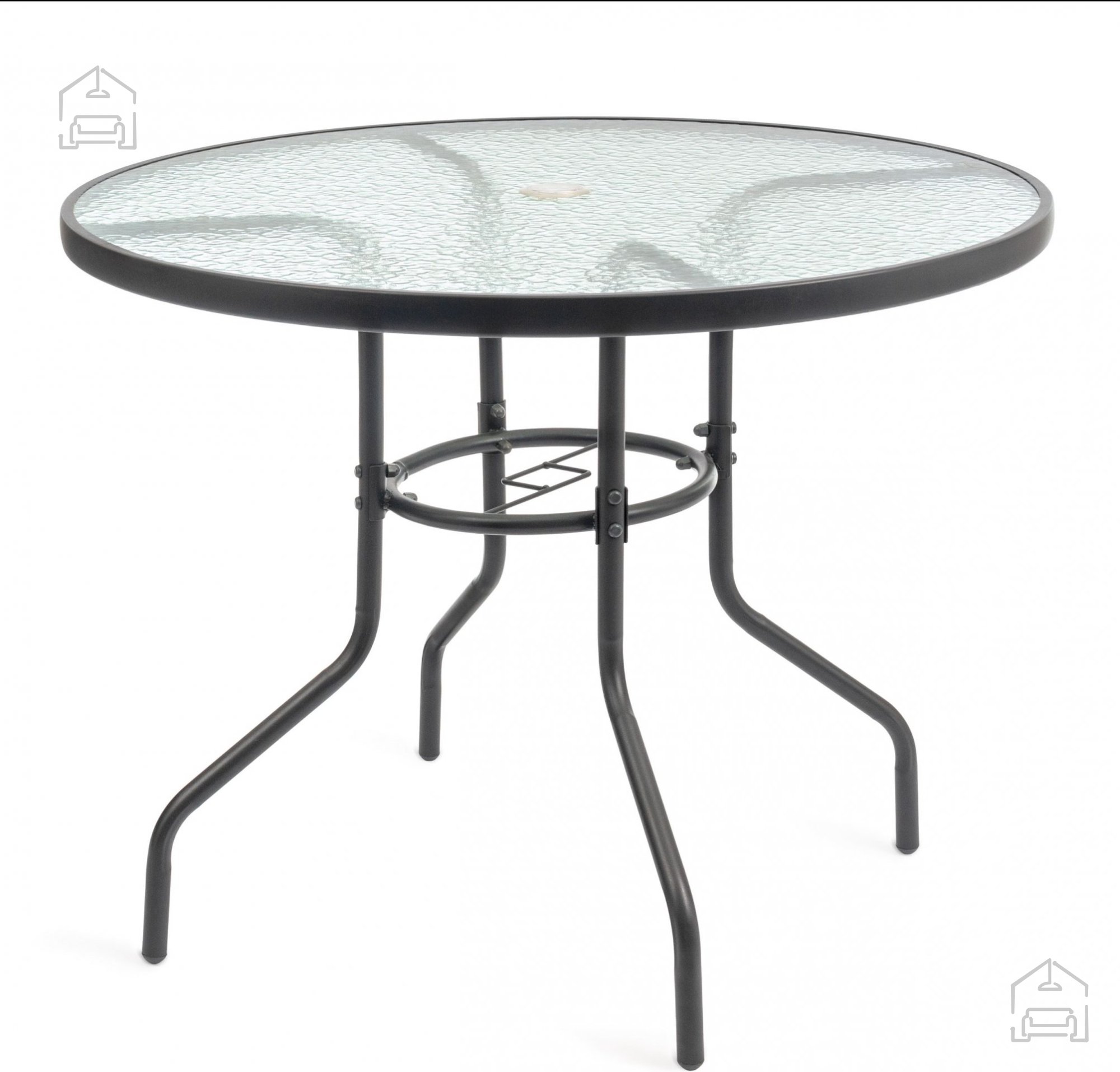 In der Mitte der Platte befindet sich ein Loch für einen Sonnenschirm, das zusätzlichen Schutz vor der Sonne bietet. Dieses Detail ist besonders nützlich in den Sommermonaten, wenn Sie angenehmen Schatten schaffen und gleichzeitig die Offenheit des Raumes bewahren möchten.