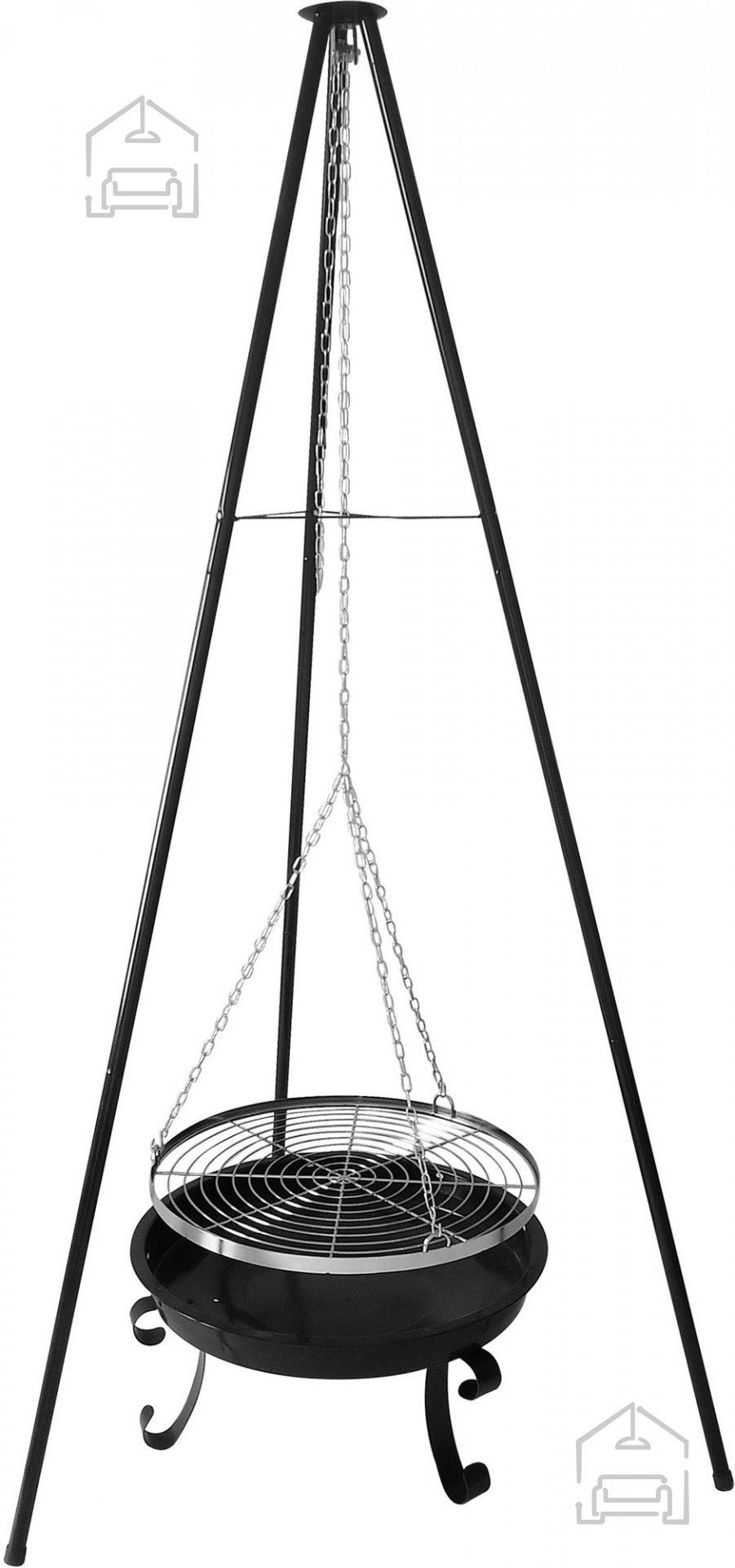 Der Garten-Hängegrill Mir338 ist aus hochwertigem Stahl gefertigt, bekannt für seine Hitzebeständigkeit und mechanische Belastbarkeit. Die Stahlschale speichert die Wärme effektiv, was ein gleichmäßiges Grillen der Speisen ermöglicht, während der dreibeinige Rahmen auch auf leicht unebenen Flächen Stabilität bietet. Die Grillfläche misst etwa 2165 cm², was ausreichend Platz für die Zubereitung von Fleisch, Gemüse oder Fisch für mehrere Personen gleichzeitig bietet. Der verchromte Rost, der an einer Kette hängt, ist korrosionsbeständig und nach dem Gebrauch leicht zu reinigen.