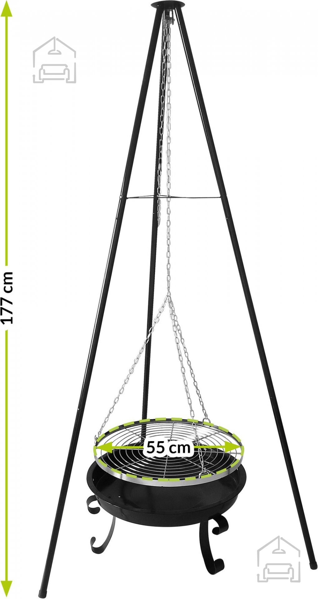 Warme Abende, angenehme Gesellschaft und der Duft des Grillens – all das schafft die perfekte Atmosphäre zur Entspannung im Garten oder auf der Terrasse. Der Hängegrill Mir338 vereint die Funktionalität eines klassischen Grills mit der Ästhetik einer modernen Gartenfeuerstelle. Sein Design basiert auf einem Dreibein, das eine sichere und stabile Nutzung ermöglicht und gleichzeitig außergewöhnliche Flexibilität bei der Zubereitung verschiedener Gerichte auf Holzkohle bietet. Dank der durchdachten Konstruktion ist dieser Grill sowohl für kleinere Familienpicknicks als auch für größere Gartenpartys geeignet.