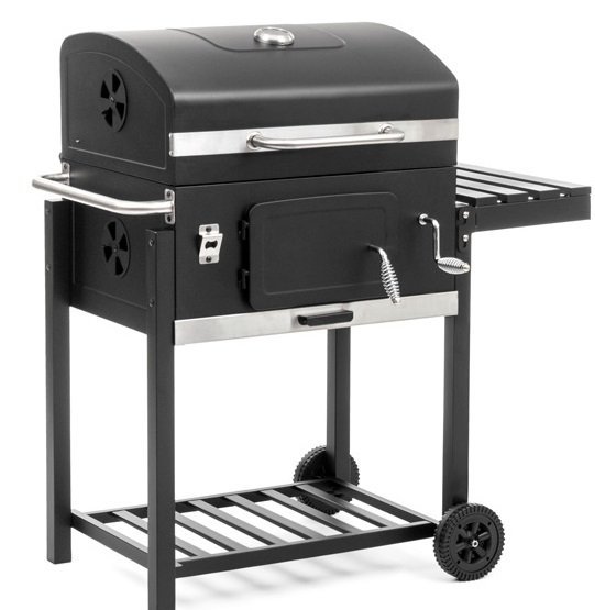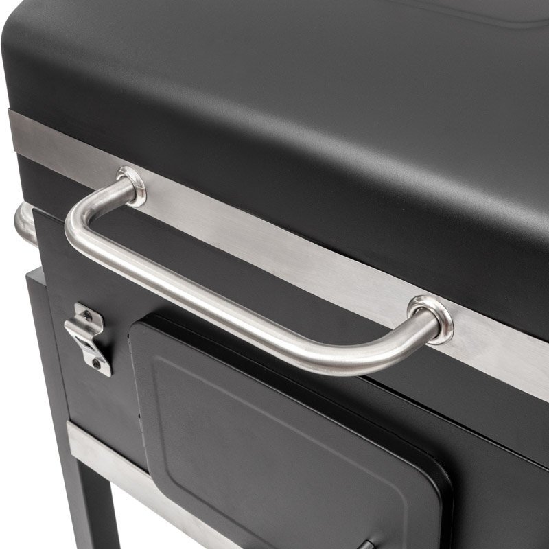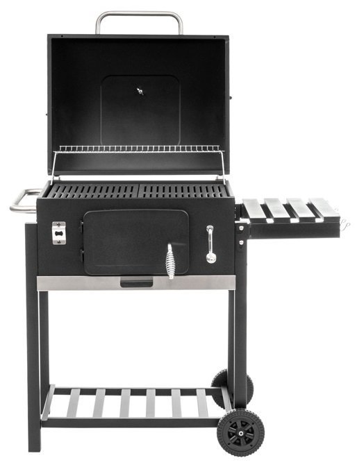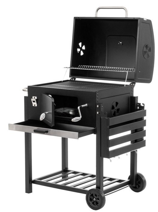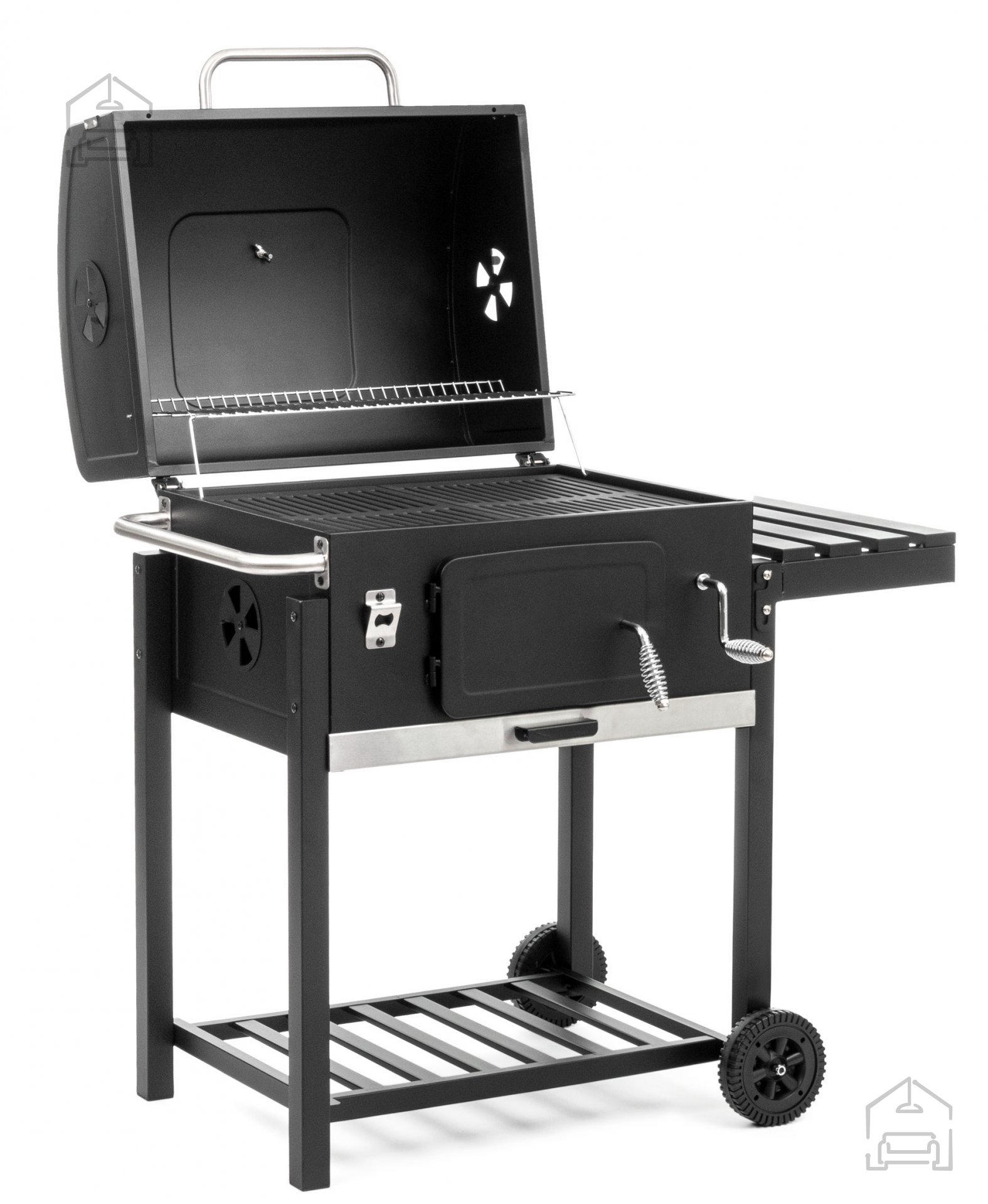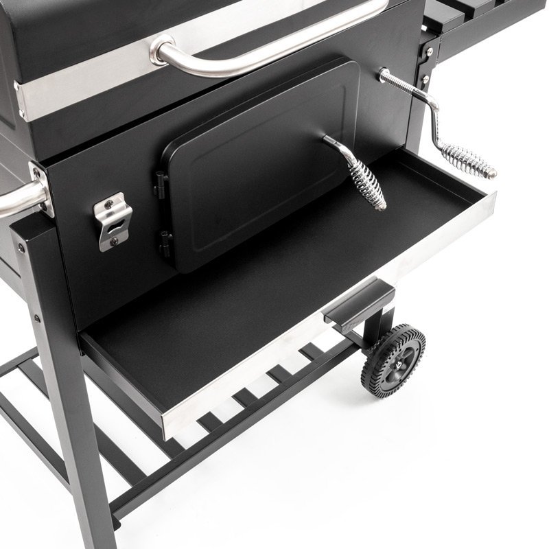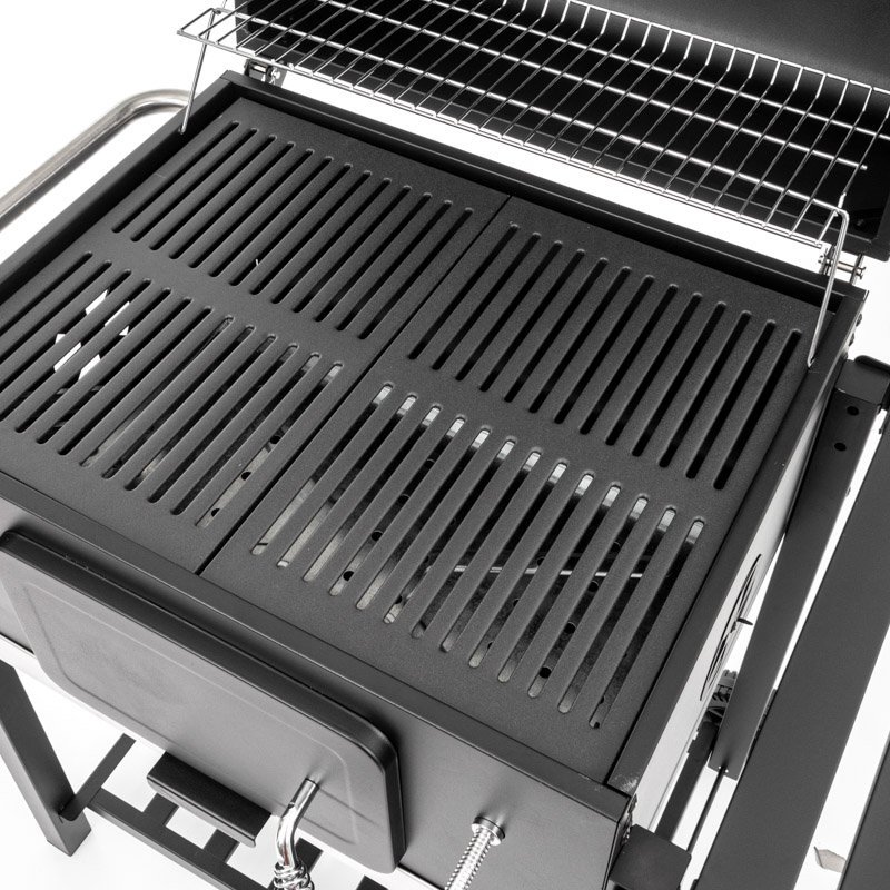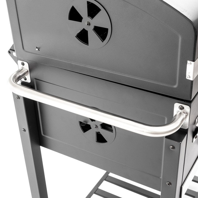 Dieser große Garten-Grill mit Deckel überzeugt durch sein modernes Design. Die Grillfläche misst 2451 cm² und bietet genügend Platz, um mehrere Speisen gleichzeitig zuzubereiten. Der Grill verfügt über einen zweiteiligen Hauptrost, einen höhenverstellbaren Gusseisen-Rost für die Kohle sowie einen emaillierten Warmhalterost, der das Grillen besonders angenehm macht. Der praktische Deckel mit integriertem Thermometer hilft dabei, die ideale Temperatur zu halten – so gelingen Ihre Gerichte perfekt. Durch die regulierbare Luftzufuhr lässt sich zudem die Qualität des Grillguts beeinflussen.