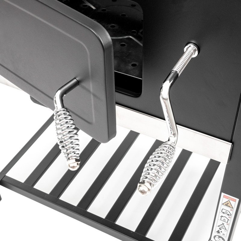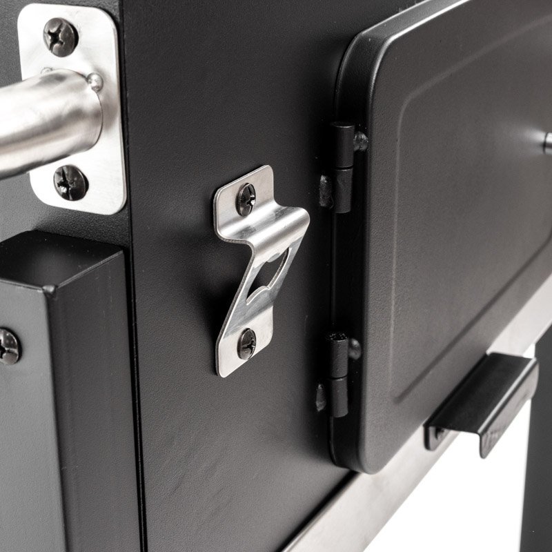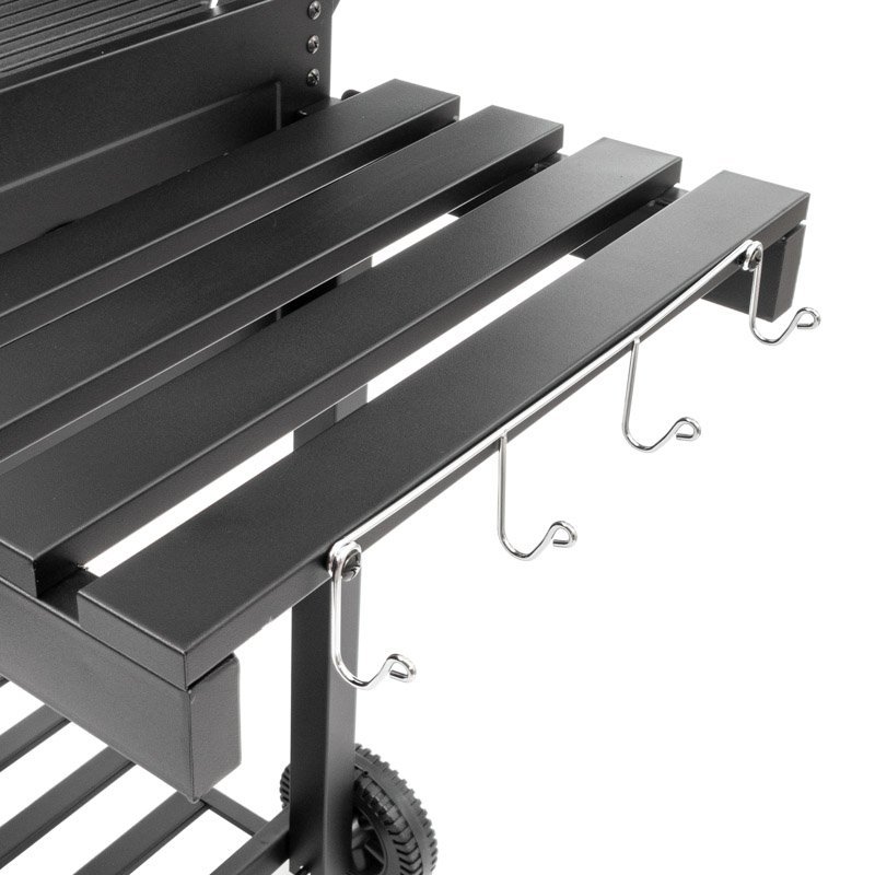 Ein großer Vorteil dieses Modells sind die vielen nützlichen Extras. Der Grill ist mit praktischen Haken und einem Flaschenöffner ausgestattet. Eine untere Ablagefläche sowie eine seitlich klappbare Ablage bieten Platz für Gewürze und Grillutensilien – ideal, um alles griffbereit zu haben. Dank des hitzebeständigen Transportgriffs und der Räder lässt sich der Grill mühelos an jeden gewünschten Platz stellen.