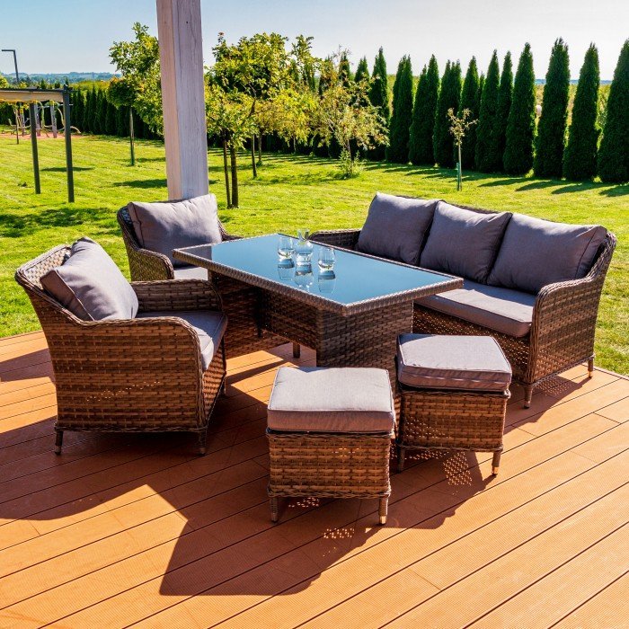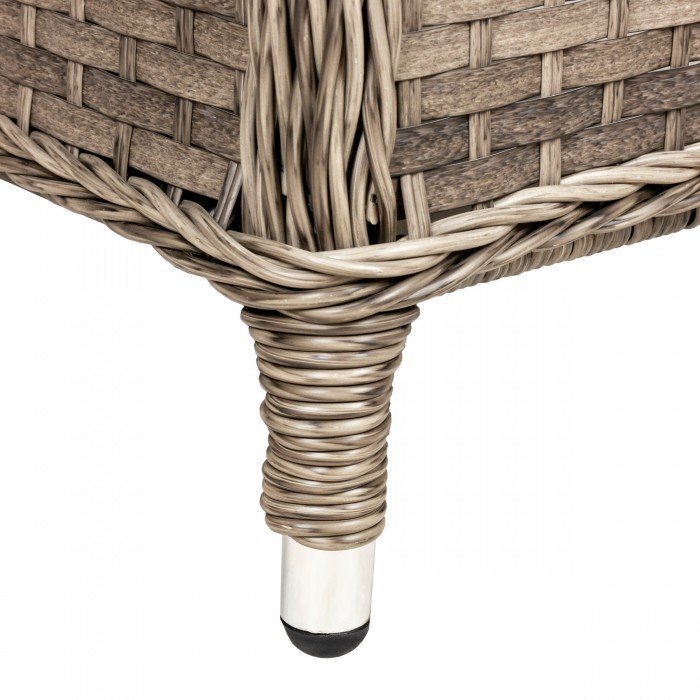 Das Gartenmöbel-Set für 7 Personen ist ideal für eine größere Terrasse und einen großen Garten. Das Set enthält ein 3-Sitzer-Sofa, 2 Sessel, 2 Hocker und einen Tisch. Die einzelnen Elemente des Sets können nach Belieben miteinander kombiniert werden, um kleinere Sets zu schaffen, die optimal an die Bedürfnisse angepasst sind. Die Struktur aus Polyrattan ist hervorragend für den Außenbereich geeignet. Die Möbel sind witterungsbeständig, UV-beständig und leicht zu pflegen. Das Rahmenmaterial ist Stahl, der die gesamte Konstruktion stabil hält.