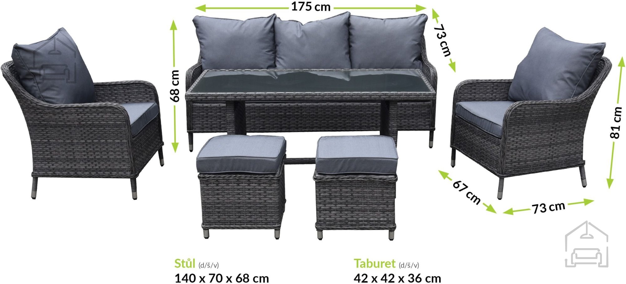 Das Gartenmöbel-Set in klassischer Ausführung ist ein Vorschlag zur Gestaltung modischer und funktionaler Außenbereiche zur Entspannung. Die Möglichkeit einer freien Konfiguration bedeutet, dass der Stil auf verschiedene Weise geplant werden kann. Dank der verwendeten Materialien wird es sich über mehrere Saisons hinweg bewähren.