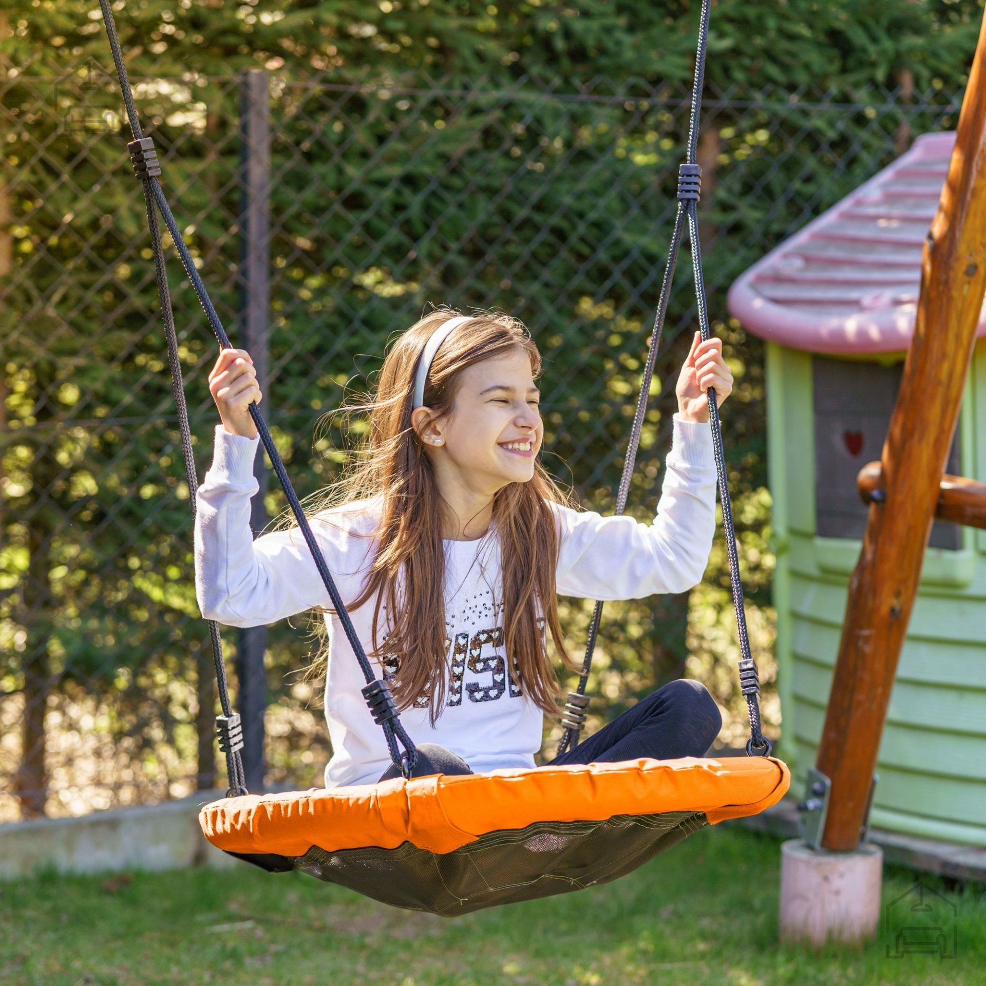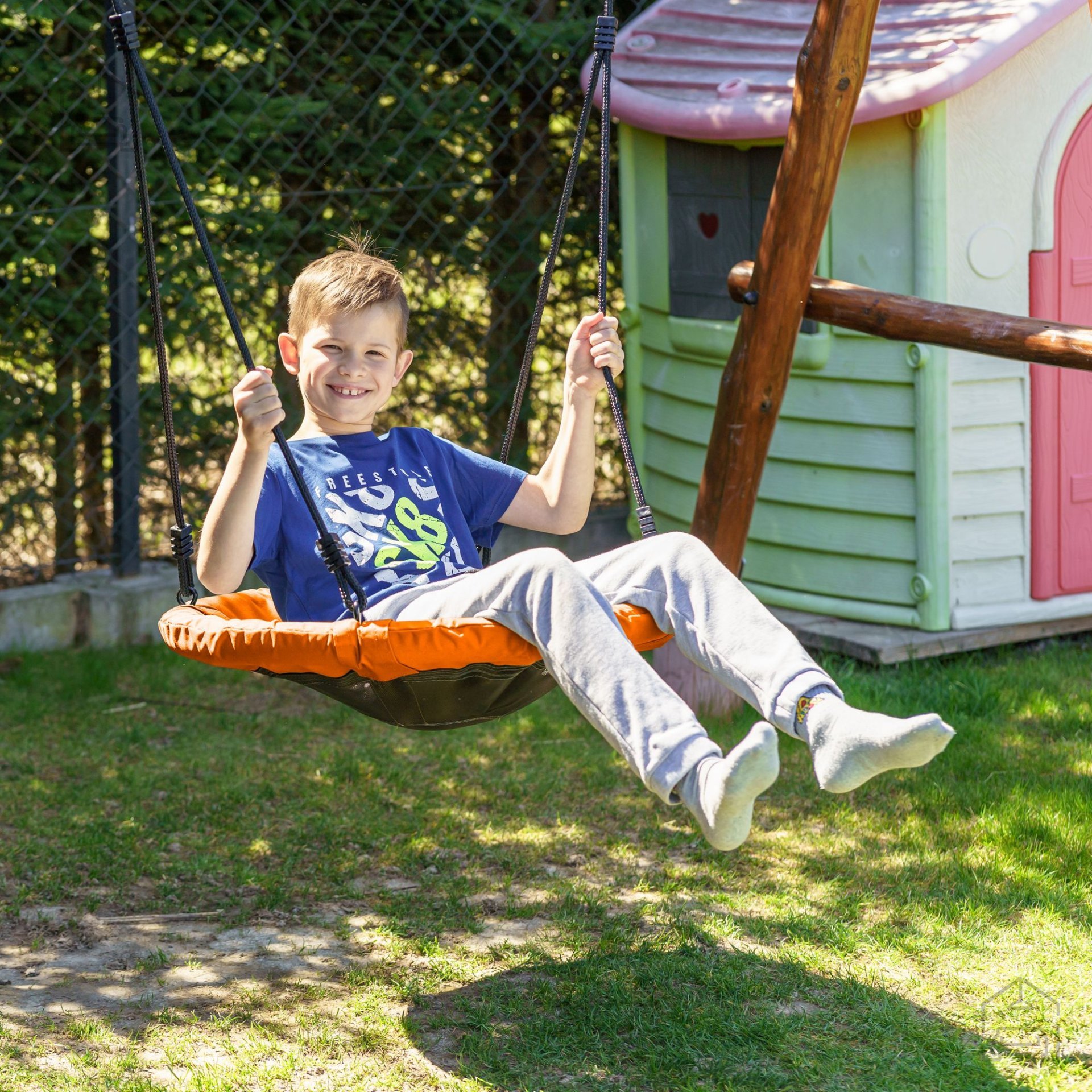Die orange Farbe der Schaukel bringt Freude und Energie, die gut zu dem Grün des Gartens oder den hellen Tönen der Terrasse passt. Die Kombination mit dem schwarzen Sitz schafft einen modernen, aber verspielten Kontrast, durch den die Schaukel als dekoratives Element hervorsticht, nicht nur als Spielgerät. Aufgrund der kompakten Abmessungen (65 × 65 cm) kann sie auch in Innenräumen verwendet werden – im Kinderzimmer, Spielzimmer oder sogar in einer Entspannungsecke, wo sich Kinder sanft beim Lesen oder Musikhören wiegen können.