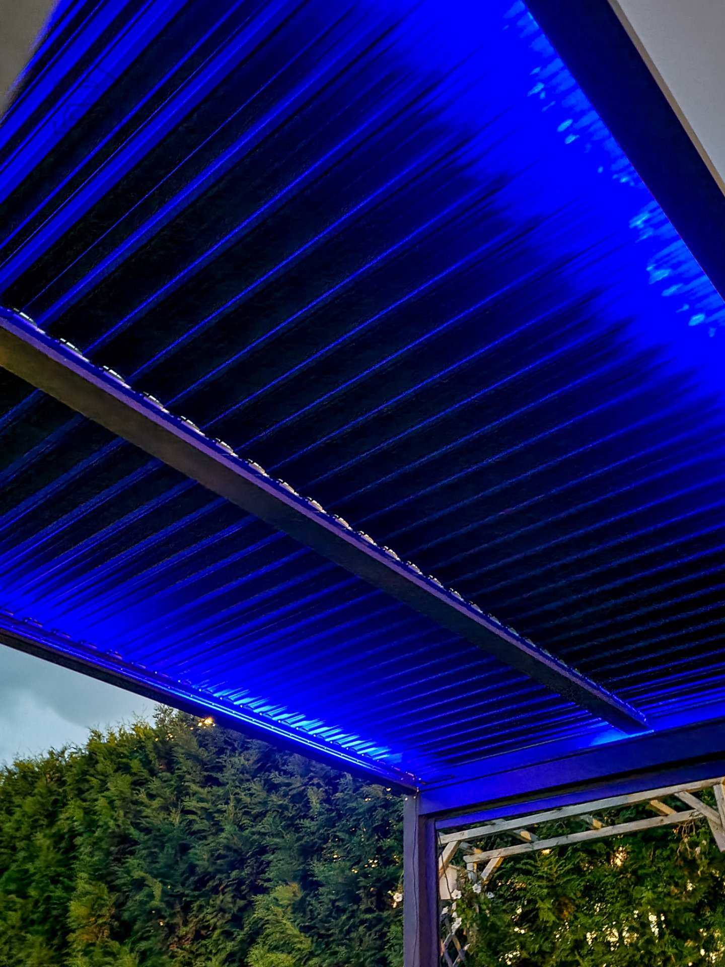 Die Pergola ist mit LED-Beleuchtung ausgestattet, was eine innovative Lösung darstellt. Sie sieht sehr beeindruckend aus und schafft am Abend eine einzigartige Atmosphäre auf der Terrasse. In Kombination mit einem minimalistischen und modernen Design sind die Pergolen ideal für die stilvollsten Terrassen der Welt geeignet. Die elegante Gartenpergola ermöglicht es Ihnen, eine funktionale und modische Außenanlage für die Entspannung zu gestalten.
