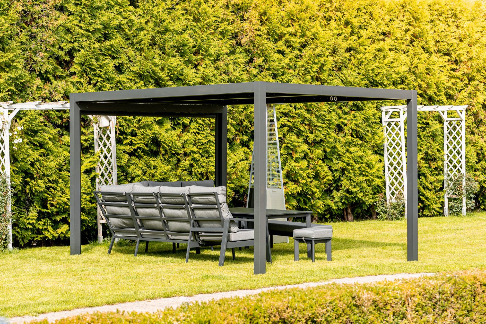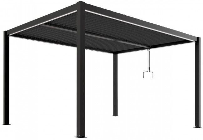Die hochwertige Gartenpergola mit den Maßen 3 x 4 Meter ist ein Vorschlag für die Überdachung von Terrasse und Garten. Sie kann im Garten als freistehende Konstruktion aufgestellt werden, aber auch direkt an das Haus angebaut werden, um so die Terrasse zu überdachen. Ausgestattet mit einem Dach, das sich mithilfe eines speziellen Öffnungssystems verstellen lässt, bietet sie Ihnen die Möglichkeit, Ihre Träume von Entspannung optimal an Ihre Bedürfnisse anzupassen. Die Aluminiumkonstruktion ist für den Außeneinsatz bestimmt und zeichnet sich durch erhöhte Korrosionsbeständigkeit aus. Die Konstruktion der Pergola ist mit einer Regenrinne versehen, was den täglichen Gebrauch komfortabler macht. Die Zellstruktur ist dank der soliden Befestigung stabil.