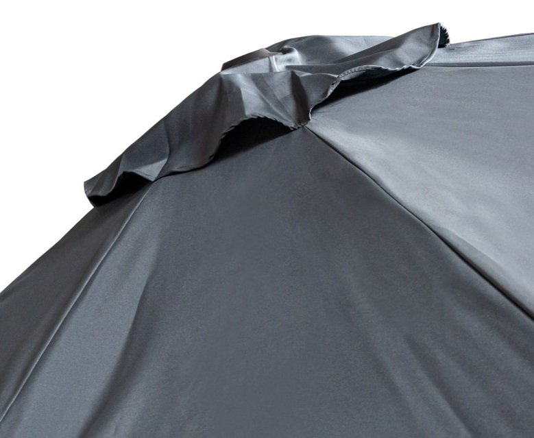 Das Tuch aus 180 g/m² Polyester schützt wirksam vor Sonnenstrahlen und bietet angenehmen Schatten ohne Engegefühl. Polyester ist bekannt für seine Beständigkeit gegen Ausbleichen und Feuchtigkeit, weshalb der Schirm sein Aussehen über mehrere Saisons hinweg behält, wenn er richtig gepflegt wird. Die graue Farbe des Stoffes wirkt nicht nur ästhetisch, sondern verringert auch die Sichtbarkeit kleinerer Flecken, was Reinigung und Pflege erleichtert.