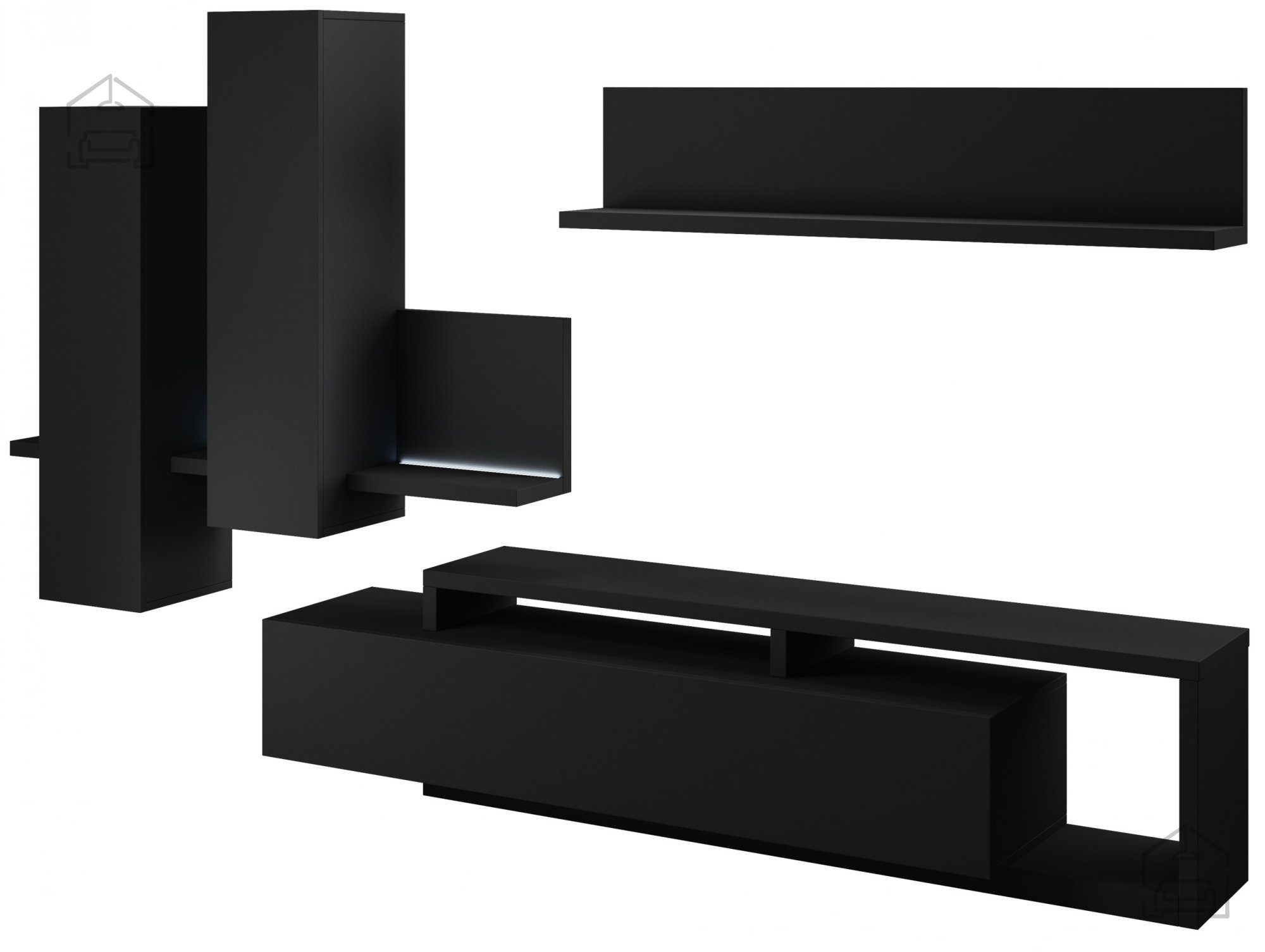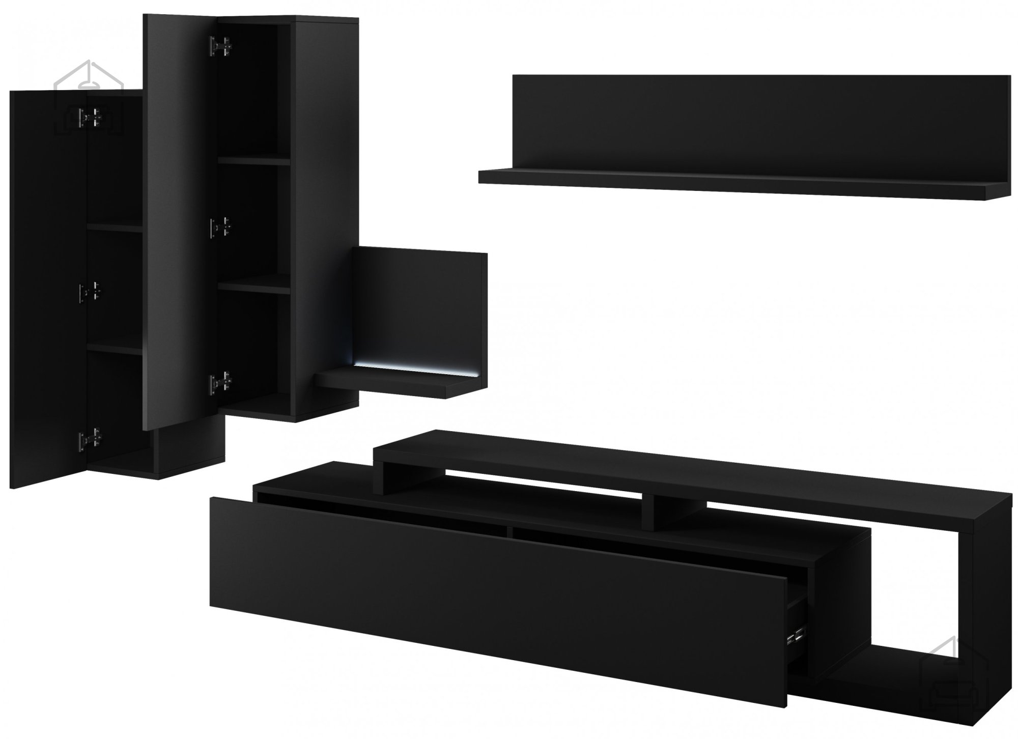 Die elegante Kollektion moderner Wohnzimmermöbel Bota ist eine beliebte Wahl unter zeitgenössischen Käufern. Geräumige Regale und Schränke sorgen dafür, dass jedes nützliche Element seinen festen Platz findet. Die Möbelplatte ist widerstandsfähig gegen Beschädigungen und garantiert eine lange Lebensdauer. Die LED-Beleuchtung rundet das Gesamtbild ab und hebt die Dekorationen hervor, die Sie in den zahlreichen Schränken platzieren.