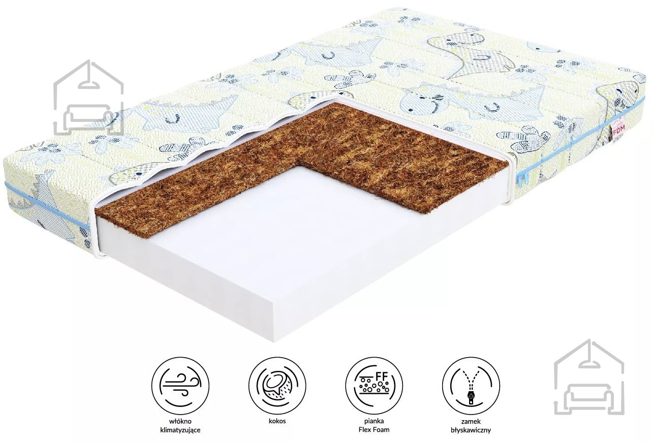 Beim Modell CALM besteht der Matratzenkern aus Polyurethanschaum FlexFoam. Dies ist ein Material, das sich nicht verformt, was die Matratze sehr komfortabel macht und Komfort während des Schlafes gewährleistet. Die hohe Qualität des Schaums bietet eine sehr gute Unterstützung für die Wirbelsäule. Sie enthält Kokosfasern, die die Matratze verstärken, ohne ihr die Flexibilität zu nehmen. Eine Klimafaserschicht erhöht den Luftstrom und erwärmt die Matratze zusätzlich. Empfohlen für Kinder.
