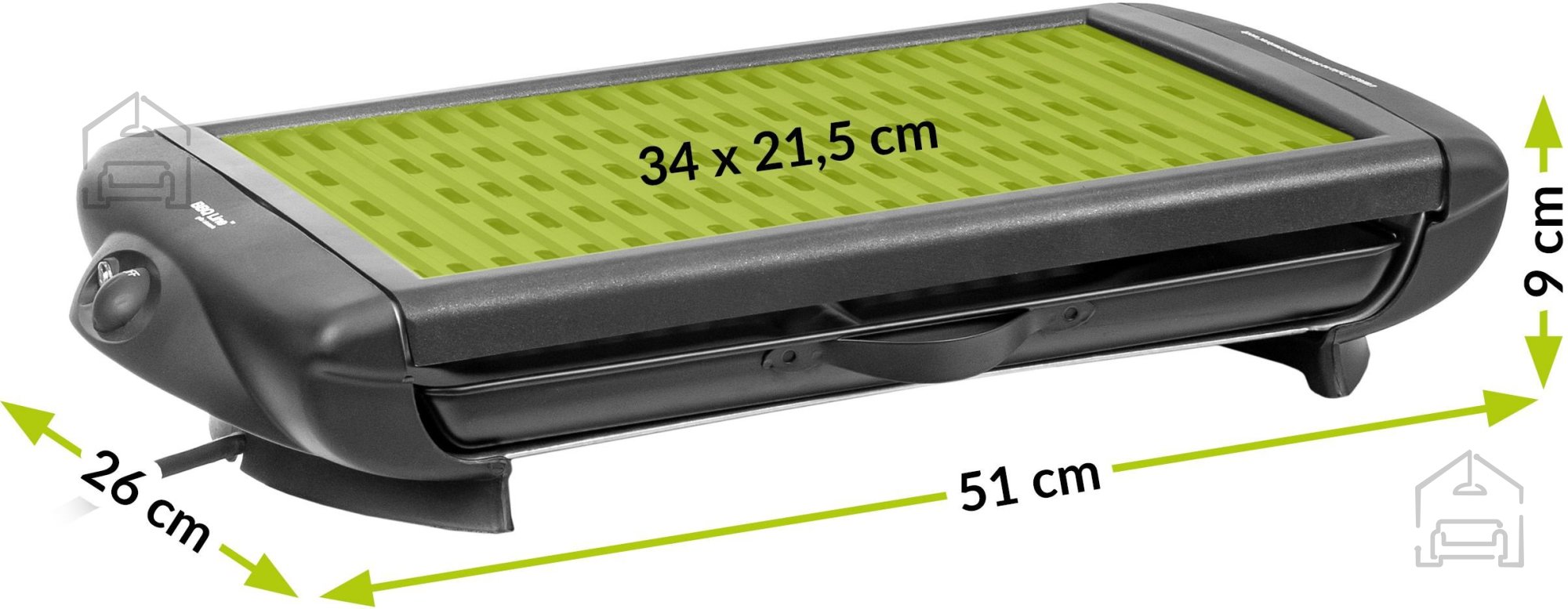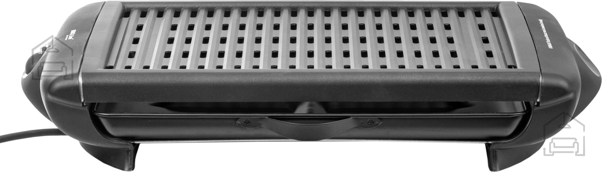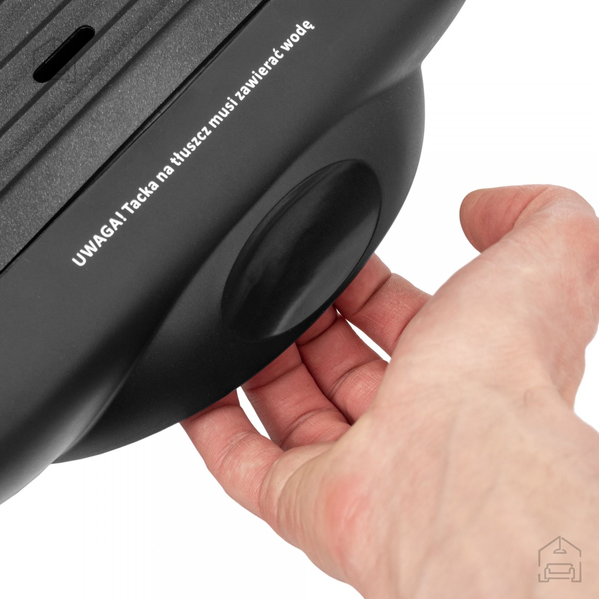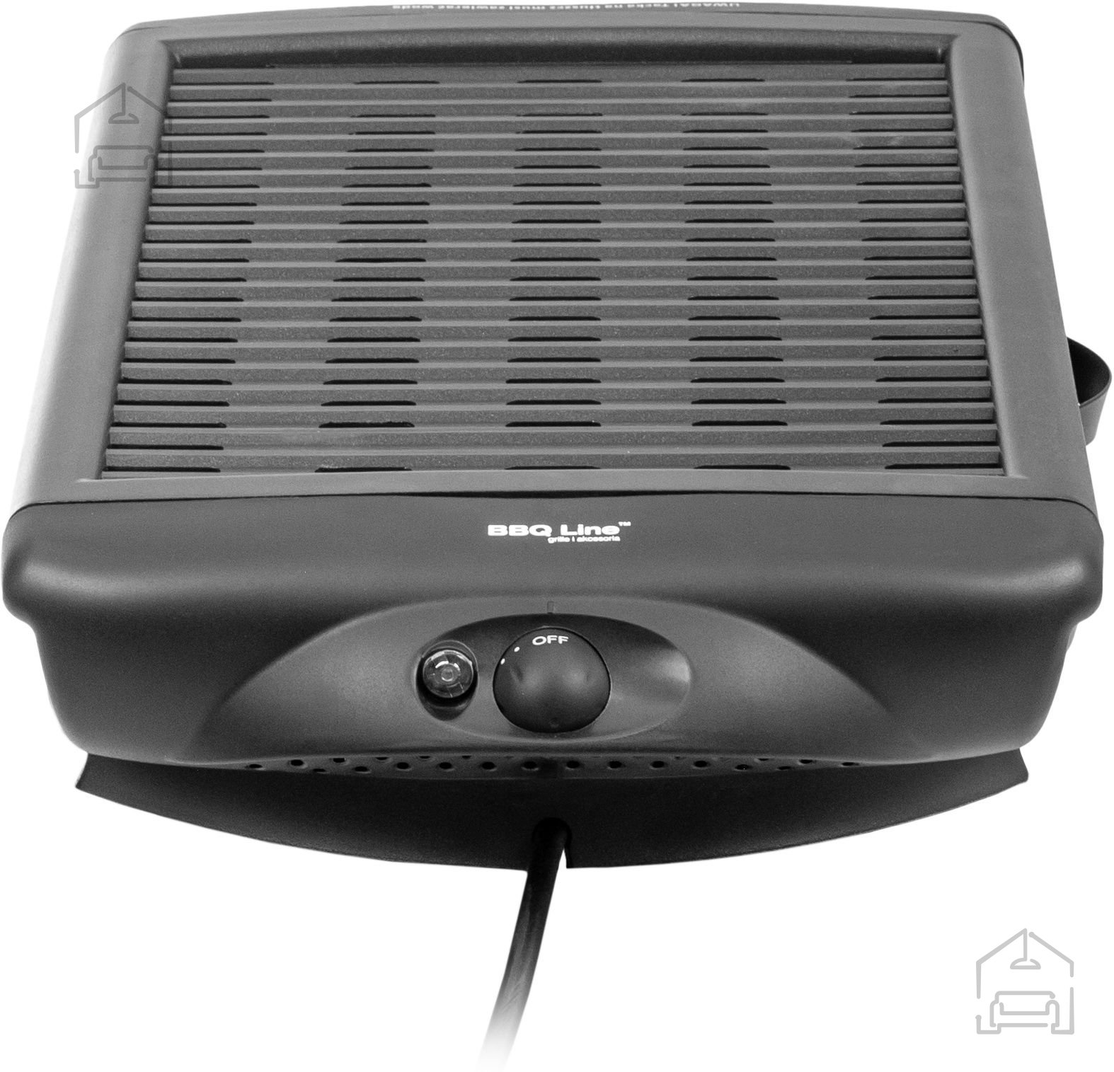 Das Gehäuse des Grills besteht aus strapazierfähigem Metall und Aluminium, was eine lange Lebensdauer und Stabilität während der Nutzung gewährleistet. Die elegante schwarze Farbe passt gut zu modernen Küchengeräten oder Gartenmöbeln, sodass sich das Gerät ästhetisch in jede Umgebung einfügt, wo immer Sie es aufstellen. Mit seinen kompakten Abmessungen – Breite 38,3 cm, Tiefe 26,5 cm und Höhe 9 cm – passt der Grill problemlos auf jede Arbeitsfläche, jeden Tisch oder jede Theke.