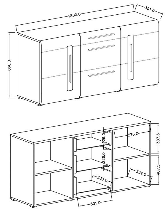 Die Kommode Tulsa verfügt über drei geräumige Schubladen in der Mitte, die eine organisierte Aufbewahrung Ihrer persönlichen Gegenstände, Kleidung oder Büromaterialien ermöglichen. Auf der linken und rechten Seite befinden sich zwei Schränke, die zusätzlichen Platz für größere Objekte, Bücher oder dekorative Accessoires bieten. Dieses durchdachte Design ermöglicht eine maximale Raumnutzung, während es gleichzeitig ein aufgeräumtes und ästhetisches Erscheinungsbild in Ihrem Zuhause bewahrt.