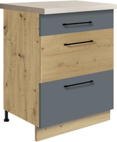 Der Unterschrank mit Schubladen Infinity 10D 60 der Marke Fadome vereint Funktionalität, modernes Design und hochwertige Verarbeitung, die für den polnischen Hersteller typisch ist. Er ist als Teil des modularen Küchensystems Infinity konzipiert, das eine Anpassung der Küche an den Raum und den persönlichen Stil ermöglicht. Der Schrank besteht aus einer laminierten Platte, während die Front aus hochwertigem MDF-Material in der Farbe Artisan gefertigt ist, das die natürliche Holzstruktur nachahmt und eine angenehme, warme Atmosphäre im Raum schafft. Schwarze Metallgriffe ergänzen das moderne Erscheinungsbild und sorgen für einen festen und bequemen Griff.