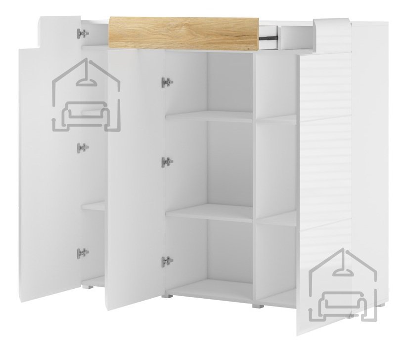 Die Kommode Toledo - Weiß - 2498DW76 ist die perfekte Wahl für alle, die Eleganz, modernes Design und Funktionalität in ihrem Zuhause vereinen möchten. Diese raffinierte Kommode, hergestellt aus hochwertigem MDF-Material, überzeugt mit den Maßen 147x39x131 cm und bietet damit ausreichend Stauraum, ohne zu viel Platz in Ihrem Zuhause einzunehmen. Ihre elegante weiße Hochglanzfarbe sowohl am Korpus als auch an den Fronten vermittelt ein Gefühl von Reinheit und Modernität, das sich mühelos mit verschiedenen Einrichtungsstilen kombinieren lässt.