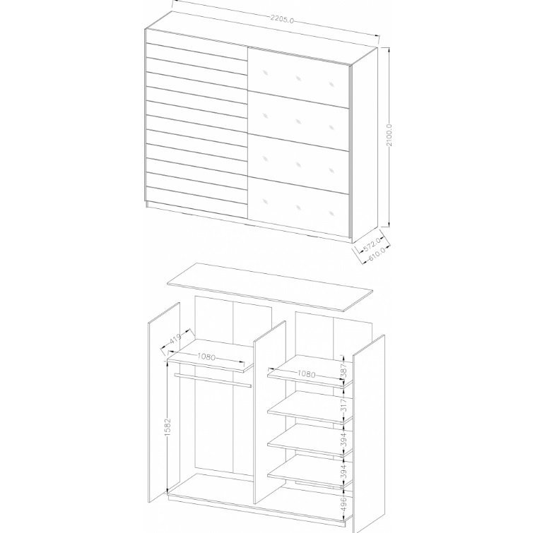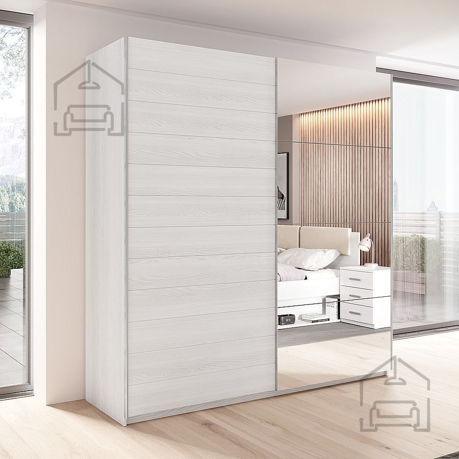 Der Kleiderschrank Galaxy 2 ist mit Schiebetüren ausgestattet, was eine ideale Lösung für kleinere Räume darstellt, da kein zusätzlicher Platz zum Öffnen benötigt wird. Die Schiebetüren ermöglichen einen einfachen Zugang zum Inhalt des Schranks und verhindern gleichzeitig die Ansammlung von Staub im Inneren.