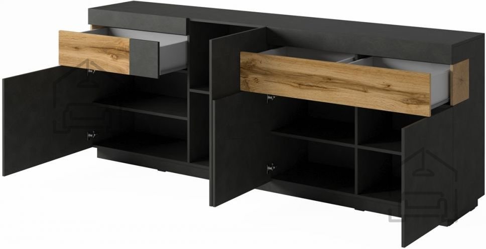 Mit den Maßen 219x40x85 cm bietet die Kommode Silke 1 reichlich Stauraum und nimmt gleichzeitig nicht zu viel Platz in Ihrem Zuhause ein. Ihre elegante schwarze matte Korpusfarbe harmoniert perfekt mit der Votan-Eichenfront und schafft so einen raffinierten und ansprechenden Look, der sich in jedes Interieur einfügt.